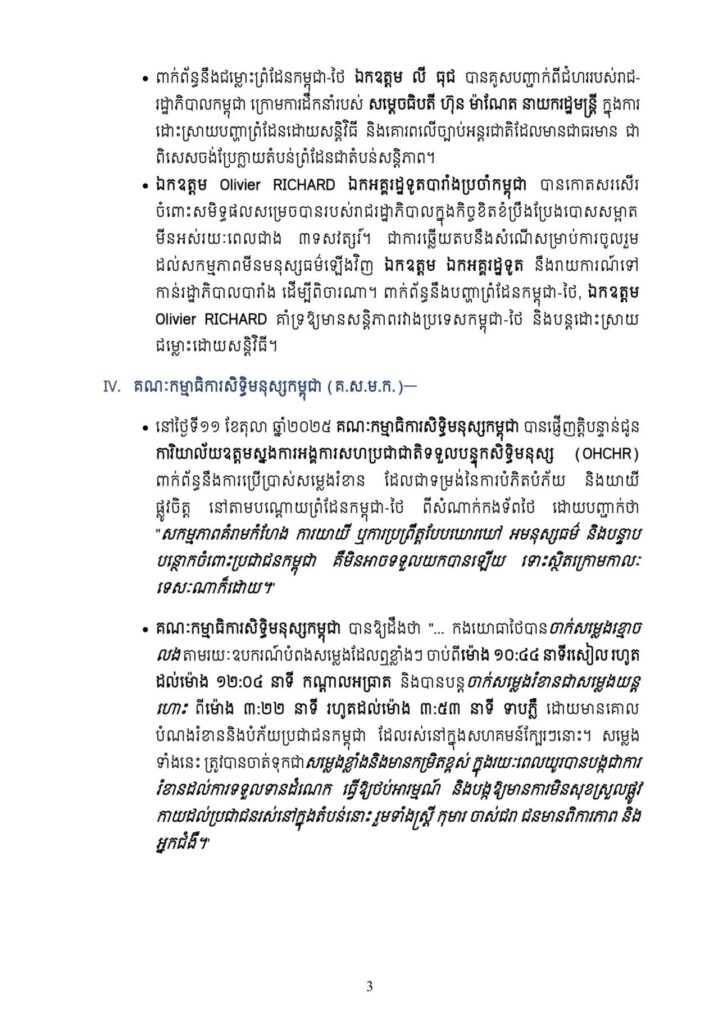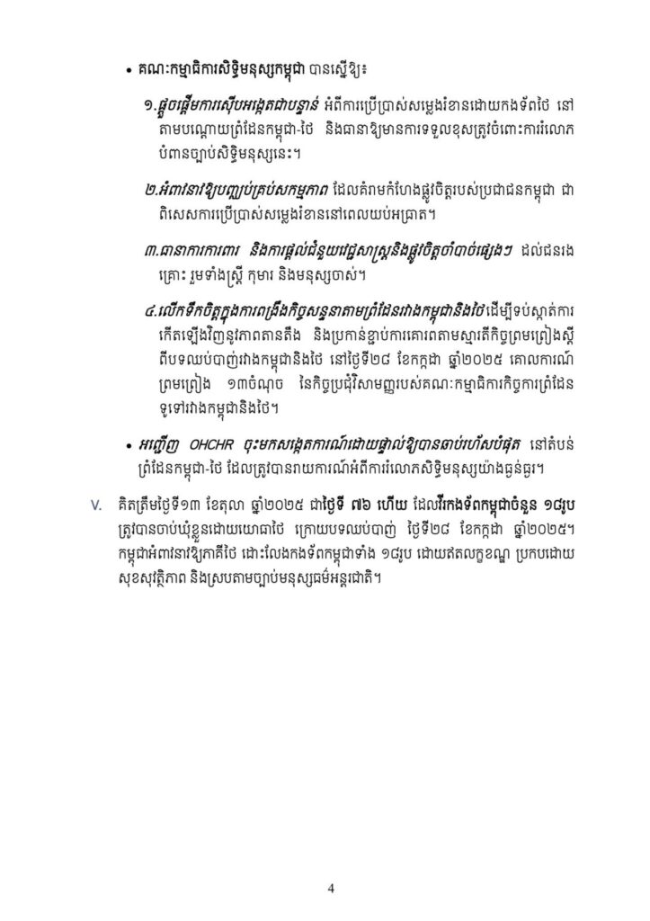 - អញ្ជើញ OHCHR ចុះមកសង្កេតការណ៍ដោយផ្ទាល់ឱ្យបានឆាប់រហ័សបំផុត នៅតំបន់ ព្រំដែនកម្ពុជា-ថៃ ដែលត្រូវបានរាយការណ៍អំពីការរំលោភសិទ្ធិមនុស្សយ៉ាងធ្ងន់ធ្ងរ។