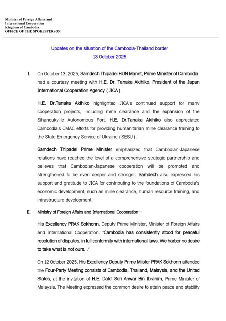 I. នៅថ្ងៃទី១៣ ខែតុលា ឆ្នាំ២០២៥ សម្ដេចមហាបវរធិបតី ហ៊ុន ម៉ាណែត នាយករដ្ឋមន្ត្រីន ព្រះរាជាណាចក្រកម្ពុជា បានអនុញ្ញាតឱ្យ ឯកឧត្តមបណ្ឌិត Tanaka Akihiko ប្រធានទីភ្នាក់ងារ សហប្រតិបត្តិការអន្តរជាតិជប៉ុន (JICA) ចូលជួបសម្តែងការគួរសម និងពិភាក្សាការងារ។