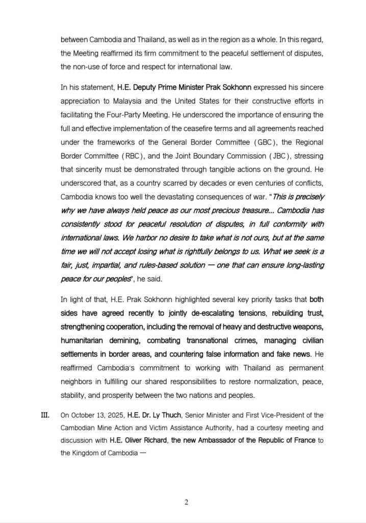 •នៅថ្ងៃទី ១២ ខែតុលា ឆ្នាំ ២០២៥ ឯកឧត្ដមឧបនាយករដ្ឋមន្ត្រី ប្រាក់ សុខុន រដ្ឋមន្តី ការបរទេស និងសហប្រតិបត្តិការអន្តរជាតិ បានអញ្ជើញចូលរួមកិច្ចប្រជុំចតុភាគី រវាង ប្រទេសកម្ពុជា ថៃ ម៉ាឡេស៊ី និងសហរដ្ឋអាម៉េរិក តាមការអញ្ជើញរបស់ឯកឧត្តម Dato Seri Anwar Bin Ibrahim នាយករដ្ឋមន្ត្រីនៃប្រទេសម៉ាឡេស៊ី។ អង្គប្រជុំបានបង្ហាញពី បំណងប្រាថ្នារួម ចំពោះសន្តិភាព និងស្ថិរភាពរវាងកម្ពុជា និងថៃ ក៏ដូចជានៅក្នុងតំបន់ទាំងមូល។ អង្គប្រជុំក៏បានបញ្ជាក់ជាថ្មីនូវការប្តេជ្ញាចិត្តយ៉ាងមុតមាំក្នុងការដោះស្រាយជម្លោះ ដោយសន្តិវិធី ការមិនប្រើកម្លាំង និងការគោរពច្បាប់អន្តរជាតិ។