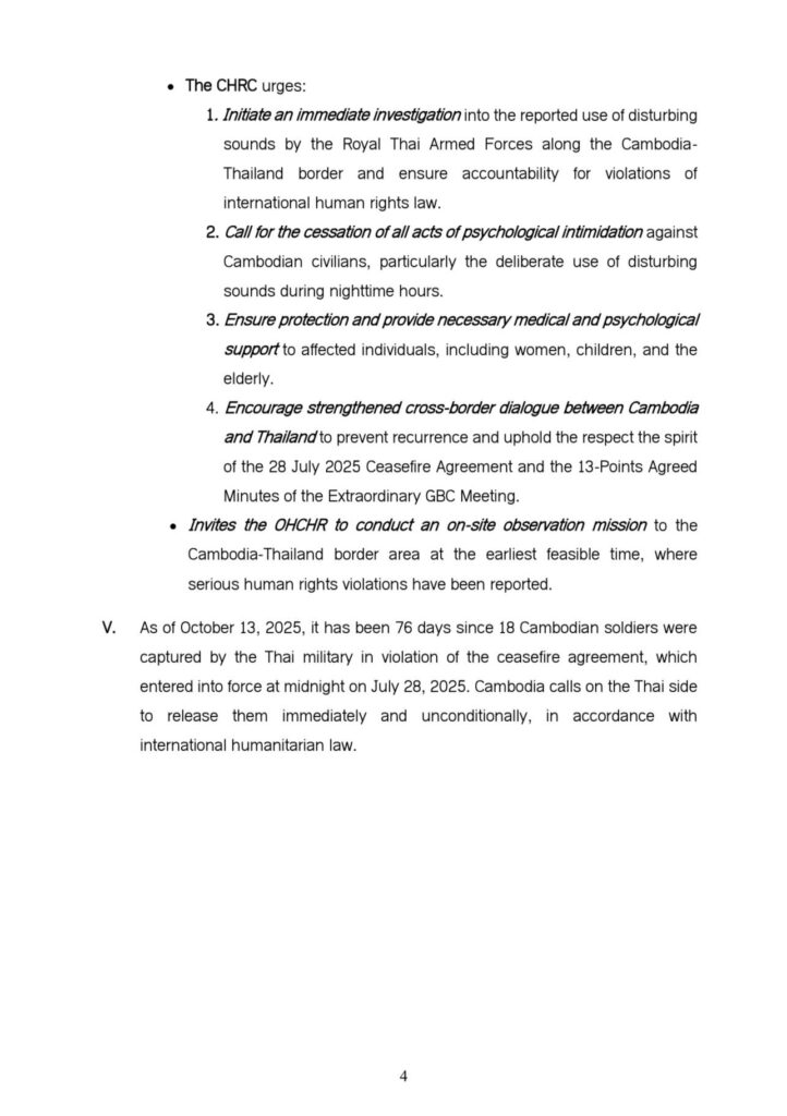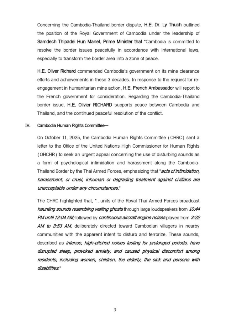 •នៅថ្ងៃទី១១ ខែតុលា ឆ្នាំ២០២៥ គណៈកម្មាធិការសិទ្ធិមនុស្សកម្ពុជា បានផ្ញើញត្តិបន្ទាន់ជូន ការិយាល័យឧត្តមស្នងការអង្គការសហប្រជាជាតិទទួលបន្ទុកសិទ្ធិមនុស្ស (OHCHR) ពាក់ព័ន្ធនឹងការប្រើប្រាស់សម្លេងរំខាន ដែលជាទម្រង់នៃការបំភិតបំភ័យ និងយាយី ផ្លូវចិត្ត នៅតាមបណ្ដោយព្រំដែនកម្ពុជា-ថៃ ពីសំណាក់កងទ័ព ដោយបញ្ជាក់ថា “សកម្មភាពគំរាមកំហែង ការយាយី ឬការប្រព្រឹត្តបែបឃោរឃៅ អមនុស្សធម៌ និងបន្ទាប បន្ថោកចំពោះប្រជាជនកម្ពុជា គឺមិនអាចទទួលយកបានឡើយ ទោះស្ថិតក្រោមកាលៈ ទេសៈណាក៏ដោយ។