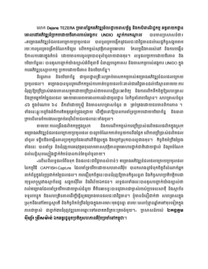 លោក Dejene TEZERA ប្រធានផ្នែកអភិវឌ្ឍន៍ហេដ្ឋារចនាសម្ព័ន្ធ និងកសិពាណិជ្ជកម្ម អគ្គនាយកដ្ឋាន គោលដៅអភិវឌ្ឍន៍ប្រកបដោយចីរភាពរបស់អង្គកា UNDIO ស្នាក់ការកណ្តាល បានមានប្រសាសន៍ថា៖ «គម្រោងអភិវឌ្ឍន៍ជលផលក្រោយប្រមូលផល បានចូលរួមបង្កើតនូវផលជះជាវិជ្ជមានដល់សេដ្ឋកិច្ចសង្គមតាម រយៈការចូលរួមពង្រីកចំណែកទីផ្សារ លើកកម្ពស់សុវត្ថិភាពម្ហូបអាហារ កែលម្អជីវភាពរស់នៅ និងការបង្កើន ឱកាសការងារក្នុងតំបន់ ដោយមានការចូលរួមបានទូលំទូលាយជាងមុន។ លទ្ធផលប្រកបដោយចីរភាព និង បរិយាប័ន្ននេះ បានគូសបញ្ជាក់យ៉ាងច្បាស់អំពីតួនាទី ជំនាញបច្ចេកទេស និងបេសកម្មរបស់អង្គការ UNIDO ក្នុង ការអភិវឌ្ឍឧស្សាហកម្ម ប្រកបដោយចីរភាព និងបរិយាប័ន្ន។
