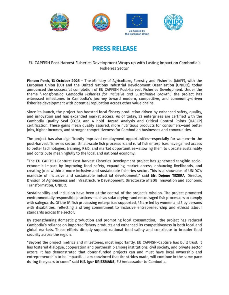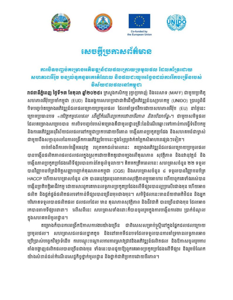 រាជធានីភ្នំពេញ ៖ ថ្ងៃទី១៣ ខែតុលា ឆ្នាំ២០២៥ ក្រសួងកសិកម្ម រុក្ខាប្រមាញ់ និងនេសាទ (MAFF) ជាមួយប្រតិភូ សហភាពអឺរ៉ុបប្រចាំកម្ពុជា (EUD) និងអង្គការសហប្រជាជាតិដើម្បីអភិវឌ្ឍន៍ឧស្សាហកម្ម (UNIDO) ប្រារព្ធពិធី បិទបញ្ចប់គម្រោងអភិវឌ្ឍន៍ជលផលក្រោយប្រមូលផល ដែលគាំទ្រថវិកាដោយសហភាពអឺរ៉ុប (EU) នាថ្ងៃនេះ ក្រោមប្រធានបទ «បរិវត្តកម្មជលផល ដើម្បីកំណើនប្រកបដោយចីរភាព និងបរិយាប័ន្ន»។ ជាមួយសមិទ្ធផល ដែលគម្រោងសម្រេចបាន ការបិទបញ្ចប់របស់គម្រោងគឺជាមូលដ្ឋានគ្រឹះនៃដំណើរឆ្ពោះទៅរកាន់ការធ្វើទំនើបកម្ម និងការអភិវឌ្ឍអនុវិស័យជលផលនៅកម្ពុជាប្រកបដោយចីរភាព បង្កើនភាពប្រកួតប្រជែង និងសហគមន៍ជាម្ចាស់ជាមួយនឹងសក្ដានុពលនៃការពង្រីកការអភិវឌ្ឍបែបនេះក្នុងខ្សែច្រវាក់តម្លៃកសិអាហារផ្សេងៗទៀត។