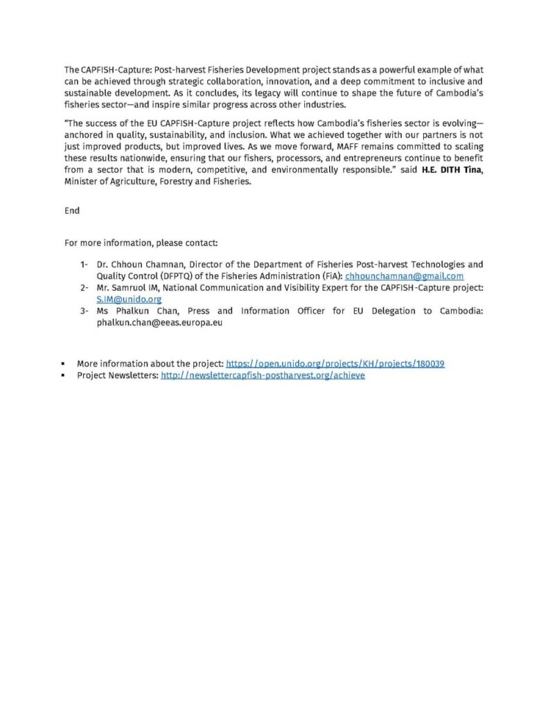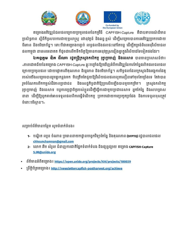 «លើសពីលទ្ធផលរំពឹងទុក និងផលជះជាវិជ្ជមានសំខាន់ៗ គម្រោងអភិវឌ្ឍន៍ជលផលក្រោយប្រមូលផល នៃកម្មវិធី CAPFISH-Capture ដែលគាំទ្រថវិកាដោយសហភាពអ៊ឺរ៉ុប បានកសាងនូវទំនុកចិត្តពីសំណាក់អ្នក ពាក់ព័ន្ធក្នុងខ្សែច្រវាក់តម្លៃជលផល។ ការជឿទុកចិត្តនេះបានជំរុញឱ្យមានកិច្ចសន្ទនា និងកិច្ចសហប្រតិបត្តិការជា យុទ្ធសាស្ត្ររវាងស្ថាប័នរដ្ឋ សង្គមស៊ីវិល និងវិស័យឯកជន។ លទ្ធផលទាំងនេះបានគូសបញ្ជាក់យ៉ាងច្បាស់ថា រាល់គម្រោងដែលគាំទ្រថវិកាដោយម្ចាស់ជំនួយ គឺមិនអាចខ្វះបាននូវភាពជាម្ចាស់របស់ប្រទេសសាម៉ី និងស្ថាប័ន ទទួលបន្ទុក និងសហគ្រិនភាពដើម្បីធ្វើឲ្យគម្រោងមានផលជះជាវិជ្ជមាន។ ខ្ញុំមានជំនឿជាក់ថា សហគ្រាសក្នុង ស្រុកនឹងនៅតែបន្តស្មារតី និងកិច្ចខិតខំប្រឹងប្រែងក្នុងភាពមោះមុតដូចគ្នា នារយៈពេលប៉ុន្មានឆ្នាំតទៅមុខទៀតក្នុង ភាពជាម្ចាស់ ជាភ្នាក់ងារជំរុញវឌ្ឍនភាពឆ្ពោះទៅអនាគតដ៏ត្រចះត្រចង់មួយ។» ប្រសាសន៍របស់ ឯកឧត្តម ម៉ីហ្គ័រ ឌីសម៉ាន់ ឯកអគ្គរដ្ឋទូតប្រតិភូសហភាពអឺរ៉ុបប្រចាំនៅកម្ពុជា។