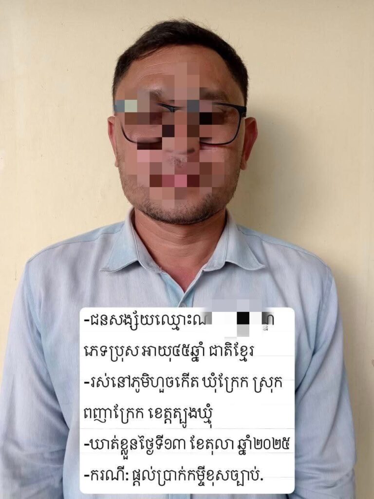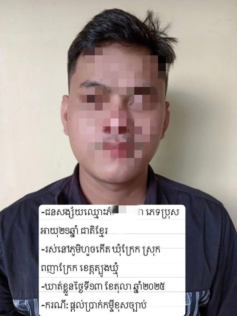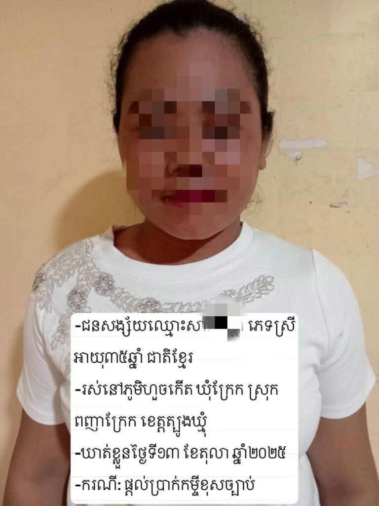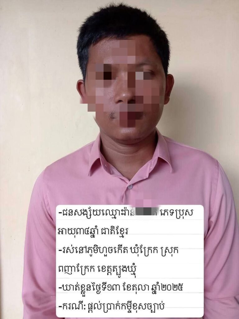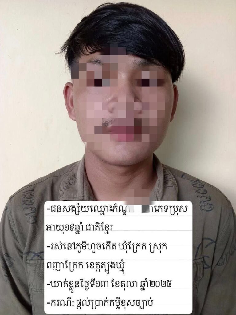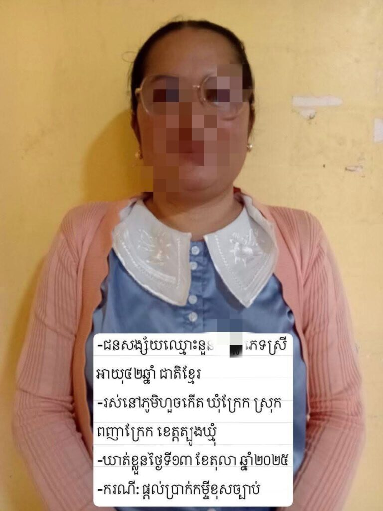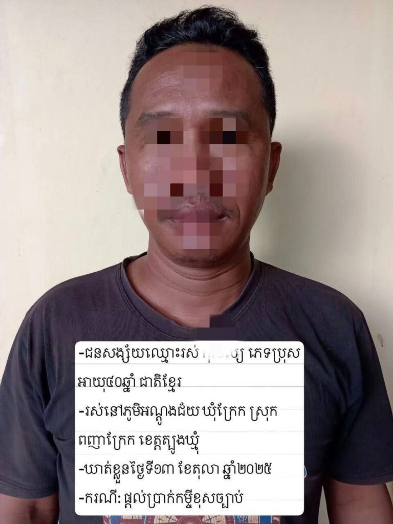 ស្នងការដ្ឋាននគរបាលខេត្តត្បូងឃ្មុំ បានឲ្យដឹងថា កាលពីថ្ងៃទី១១ ខែតុលា ឆ្នាំ២០២៥ មានផេកហ្វេសប៊ុកឈ្មោះ ហេតុការណ៍ថ្មីៗ បានចុះផ្សាយខ្លឹមសារថា ប្រជាពលរដ្ឋរកស៊ីបន្តិចបន្តួចពុំមានលទ្ធភាពបង់ការប្រាក់ឲ្យក្រុមអ្នករកស៊ីចងការប្រាក់ថ្លៃកប់ពពក ក៏ត្រូវក្រុមអ្នករកស៊ីចងការប្រាក់ទាំងនោះ យករូបថតរបស់ពួកគាត់ ទៅបិទនៅតាមទីសាធារណៈ , ទីតាំងរកស៊ីចងការប្រាក់ខុសច្បាប់នេះ ស្ថិតក្នុងភូមិសាស្ត្រស្រុកពញាក្រែក ខេត្តត្បូងឃ្មុំ , ពេលនេះ កម្លាំងនគរបាល ស្រាវជ្រាវឃាត់ខ្លួនអ្នករកស៊ីចងការប្រាក់ខ្ពស់កប់ពពកទាំងនោះ បានចំនួន ១០នាក់។