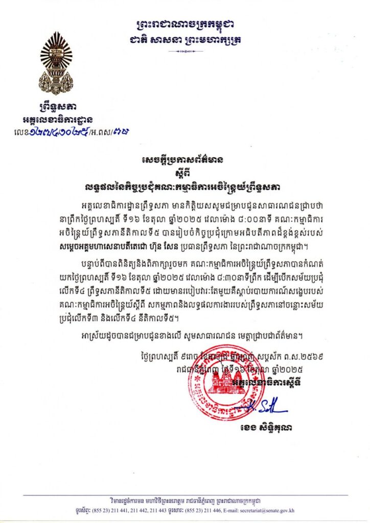ភ្នំពេញ ៖ នាព្រឹកថ្ងៃព្រហស្បតិ៍ ទី១៦ ខែតុលា ឆ្នាំ២០២៥ វេលាម៉ោង ៨:០០នាទី គណៈកម្មាធិការអចិន្ត្រៃយ៍ព្រឹទ្ធសភានីតិកាលទី៥ បានរៀបចំកិច្ចប្រជុំក្រោមអធិបតីភាពដ៏ខ្ពង់ខ្ពស់របស់សម្ដេចអគ្គមហាសេនាបតីតេជោ ហ៊ុន សែន ប្រធានព្រឹទ្ធសភា នៃព្រះរាជាណាចក្រកម្ពុជា ដើម្បីពិនិត្យសម្រេចលើរបៀបវារៈចំនួន៣ មានដូចខាងក្រោម៖