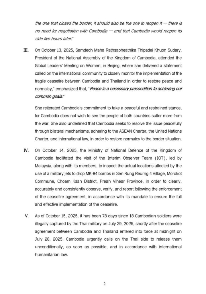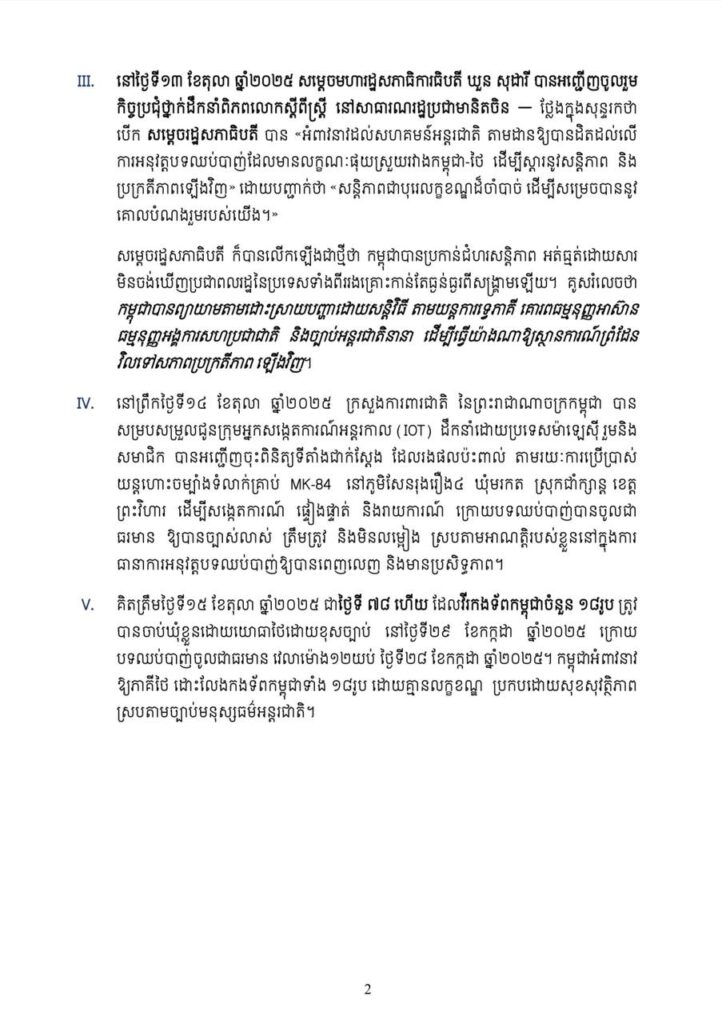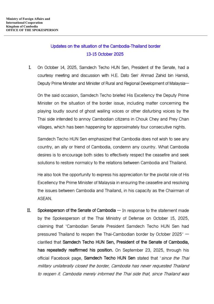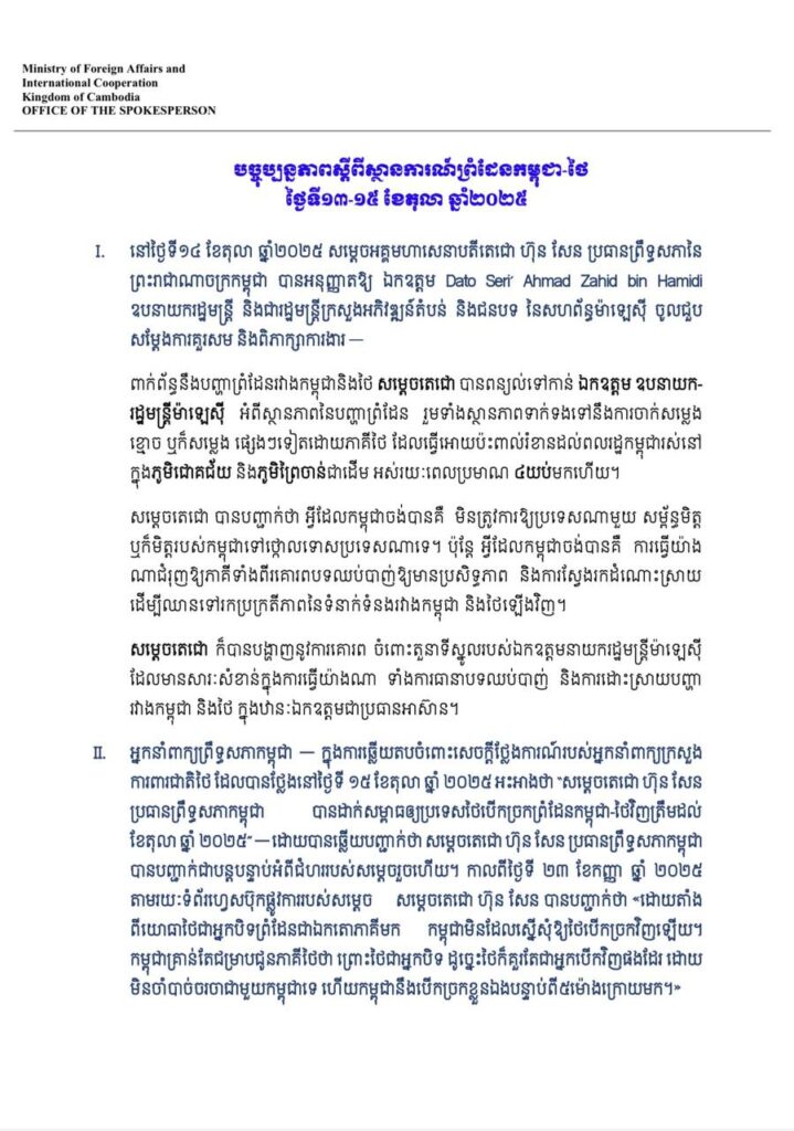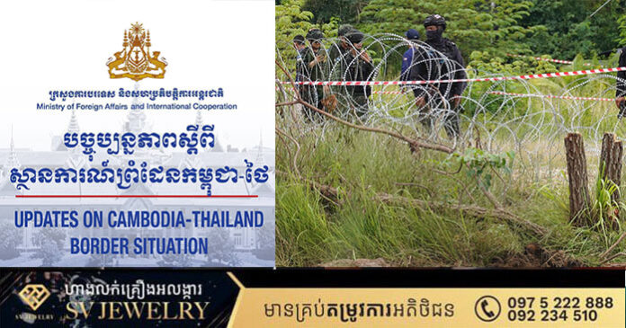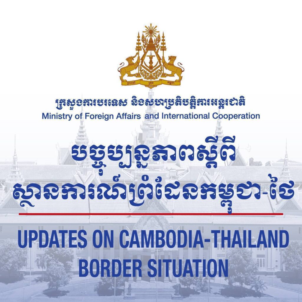ភ្នំពេញ ៖ ក្រសួងការបរទេសនិងសហប្រតិបត្តិការអន្តរជាតិ បានចេញរបាយការណ៍ពីបច្ចុប្បន្នភាពស្ដីពីស្ថានការណ៍ព្រំដែនកម្ពុជា-ថៃ ថ្ងៃទី ១៣-១៥ ខែតុលា ឆ្នាំ២០២៥៕ រក្សាសិទ្ធដោយ៖សុទ្ធលី