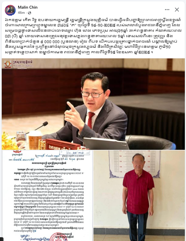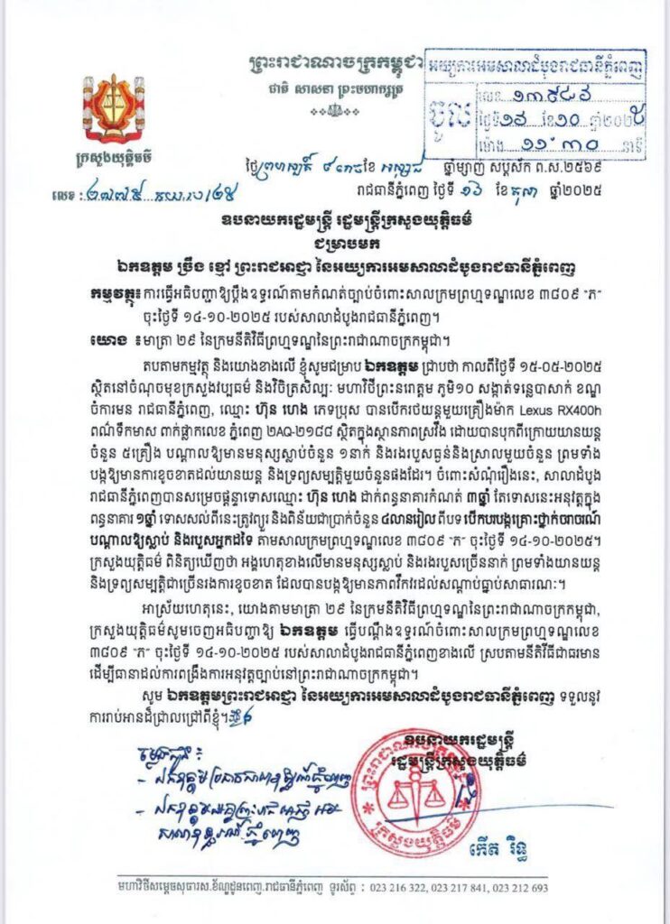 នៅថ្ងៃទី ១៦ ខែ តុលា ឆ្នាំ២០២៥ ឯកឧត្តមឧបនាយករដ្ឋមន្ត្រី រដ្ឋមន្ត្រីក្រសួងយុត្តិធម៌ បានចេញលិខិតជម្រាបមកឯកឧត្តម ច្រឹង ខៅ្ម ព្រះរាជអាជា្ញ នៃអយ្យការអមសាលាដំបូងរាជធានីភ្នំពេញ ក្នុងកម្មវត្ថុ៖ ការធ្វើអធិបញ្ញាឱ្យប្តឹងឧទ្ធរណ៍តាមកំណត់ច្បាប់ចំពោះសាលក្រមព្រហ្មទណ្ឌលេខ ៣៨០៩ “ភ” ចុះថ្ងៃទី ១៤-១០-២០២៥ របស់សាលាដំបូងរាជធានីភ្នំពេញ។
