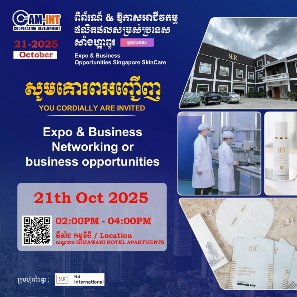 ទាំងនេះ មាននៅក្នុងពិធីពិព័រណ៍ពាណិជ្ជកម្មផលិតផលសម្រស់សិង្ហបុរី – Expo & Business Networking Or Business Opportunities Singapore Skin Care ដែលជាផលិតផលសម្រិតសម្រាំងនៃក្រុមអ្នកបច្ចេកទេសគ្រូពេទ្យជំនាញពីប្រទេសសិង្ហបុរី នឹងជួបជាមួយលោក-អ្នក នៅថ្ងៃទីនិ២១ ខែតុលា ឆ្នាំ២០២៥ វេលាម៉ោង ២ : ០០ – ៤ : ០០នាទីរសៀល សណ្ឋាគារ ហ៊ីម៉ាវ៉ារី មាត់ទន្លេ រាជធានីភ្នំពេញ រៀបចំដោយ ” សមាគមអភិវឌ្ឍន៍សហប្រតិបត្តិការសេដ្ឋកិច្ចកម្ពុជា-អន្តរជាតិ ” ដែលធ្វើប្រតិបត្តិការក្នុងគោលដៅធ្វើយ៉ាងណា ឱ្យលោក-អ្នកដែលជាប្រធានក្រុមហ៊ុន សហគ្រិនភាព ពាណិជ្ជករ អាជីវករ វិនិយោគិន និងលោក-អ្នក ដែលមានចំណាប់អារម្មណ៍លើកជំនួញ-អាជីវកម្មផ្សេងៗ ពាក់ព័ន្ធនឹងផលិតផលសម្រស់ បានជួបជុំគ្នា ពិភាក្សា រិះរកវិធីសាស្ត្រ មធ្យោបាយ ឆ្ពោះទៅរីកចម្រើនទាំងអស់គ្នា។