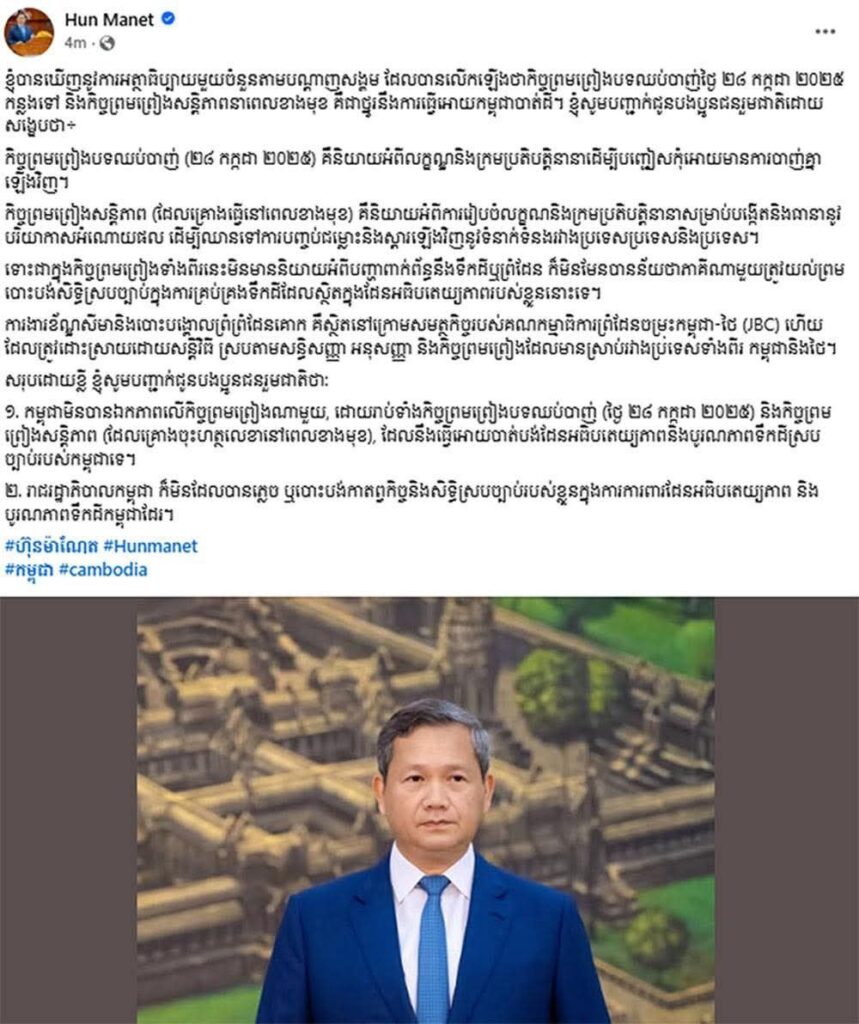 ភ្នំពេញ ៖ សម្តេចធិបតី ហ៊ុន ម៉ាណែត នាយករដ្ឋមន្ត្រីកម្ពុជា តាមរយៈទំព័រហ្វេសប៊ុកនាថ្ងៃអាទិត្យនេះបានបញ្ជាក់ថា កម្ពុជាមិនបានឯកភាពលើកិច្ចព្រមព្រៀងណាមួយ, ដោយរាប់ទាំងកិច្ចព្រមព្រៀងបទឈប់បាញ់ (ថ្ងៃ ២៨ កក្កដា ២០២៥) និងកិច្ចព្រមព្រៀងសន្តិភាព (ដែលគ្រោងចុះហត្ថលេខានៅពេលខាងមុខ), ដែលនឹងធ្វើអោយបាត់បង់ដែនអធិបតេយ្យភាពនិងបូរណភាពទឹកដីស្របច្បាប់របស់កម្ពុជាទេ។ រាជរដ្ឋាភិបាលកម្ពុជា ក៏មិនដែលបានភ្លេច ឬបោះបង់កាតព្វកិច្ចនិងសិទ្ធិស្របច្បាប់របស់ខ្លួនក្នុងការការពារដែនអធិបតេយ្យភាព និងបូរណភាពទឹកដីកម្ពុជាដែរ ។