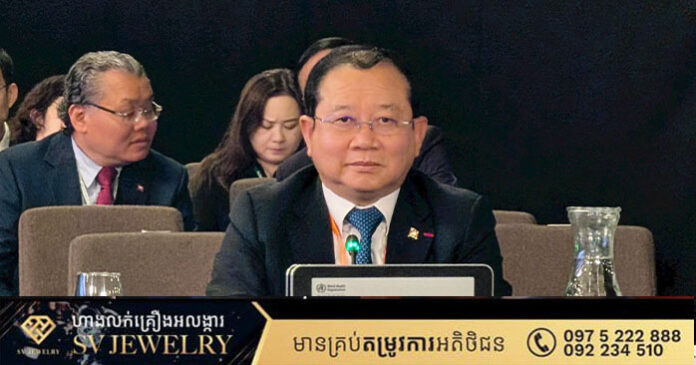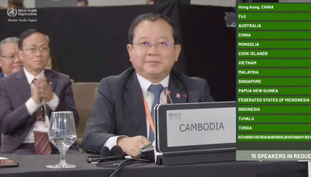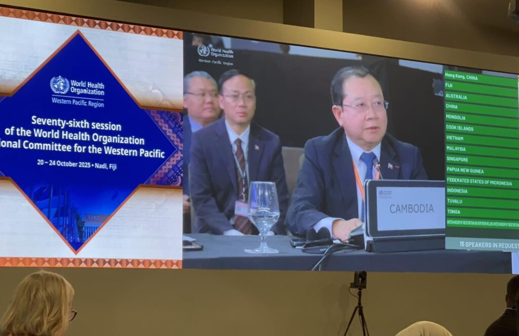 នារសៀលថ្ងៃចន្ទ ១៣រោច ខែអស្សុជ ឆ្នាំម្សាញ់ សប្តស័ក ព.ស.២៥៦៩ ត្រូវនឹងថ្ងៃទី២០ ខែតុលា ឆ្នាំ២០២៥ ក្នុងនាមក្រសួងសុខាភិបាល នៃព្រះរាជាណាចក្រកម្ពុជា ឯកឧត្តមសាស្ត្រាចារ្យ ឈាង រ៉ា រដ្ឋមន្ត្រីក្រសួងសុខាភិបាល បានអញ្ជើញធ្វើបទអន្តរាគមន៍ ក្នុងសម័យកិច្ចប្រជុំពេញអង្គ នៃកិច្ចប្រជុំលើកទី៧៦ របស់អង្គការសុខភាពពិភពលោកប្រចាំតំន់ប៉ាស៊ីហ្វិកខាងលិច។