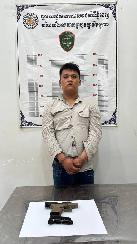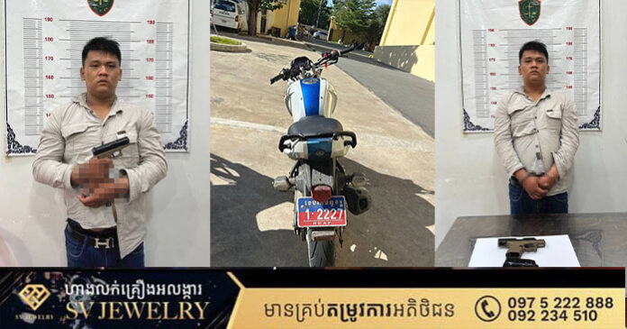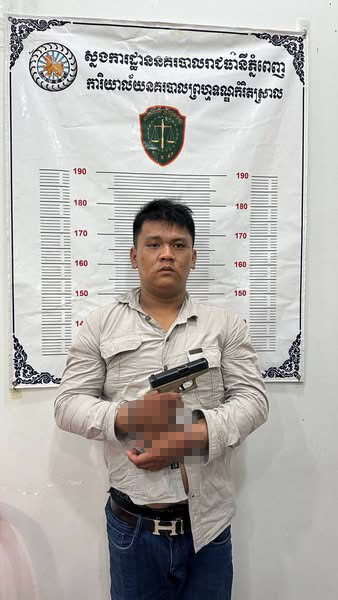 ក្រោយពីធ្វេីការឃាត់ខ្លួនជនសង្ស័យរួចមក បានដកហូតវត្ថុតាងរួមមាន ម៉ូតូម៉ាក YAMAHA FZ ពណ៏ស ខៀវ ពាក់ស្លាកលេខ ខេមរភូមិន្ទ 1-2227 និងកាំភ្លើងហ្គាស កែច្នៃ ម៉ាក Glock បាញ់គ្រាប់កាំកង់ (កាន់ធ្វើសកម្មភាព)។