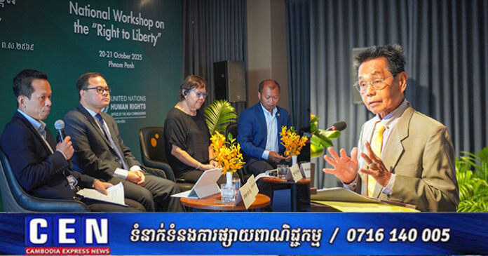 ភ្នំពេញ ៖ តំណាងដ៏ខ្ពង់ខ្ពស់ឱ្យ ឯកឧត្តម កែវ រ៉េមី ទេសរដ្ឋមន្រ្តី ប្រធានគណៈកម្មាធិការសិទ្ធិមនុស្សកម្ពុជា(គ.ស.ម.ក.) ឯកឧត្តម អ៊ិត រ៉ាឌី អនុប្រធាន គ.ស.ម.ក. បានអញ្ជើញជាអធិបតីក្នុងពិធីបើកនិងបិទសិក្ខាសាលាថ្នាក់ជាតិស្តីពី “សិទ្ធិមានសេរីភាព” ក្រោមកិច្ចសហការរៀបចំរវាងគណៈកម្មាធិការសិទ្ធិមនុស្សកម្ពជា និងការិយាល័យឧត្តមស្នងការអង្គការសហប្រជាជាតិទទួលបន្ទុកសិទ្ធិមនុស្សប្រចាំកម្ពុជា(OHCHR) ដោយមានការអញ្ជើញចូលរួមពីសំណាក់ចៅក្រម ព្រះរាជអាជ្ញាមកពីតំបន់សាលាឧទ្ធរណ៍ចំនួន ៦ (រួមមានសាលាឧទ្ធរណ៍ភ្នំពេញ កណ្ដាល កំពង់ស្ពឺ តាកែវ ព្រៃវែង និងកំពង់ឆ្នាំង) មេធាវីស្ម័គ្រចិត្តសិទ្ធិមនុស្ស ព្រមទាំងមន្រ្តីរាជការ គ.ស.ម.ក. សរុបប្រមាណ ៤០នាក់។