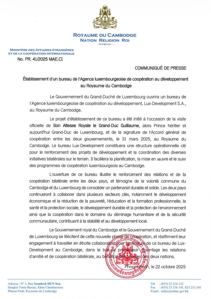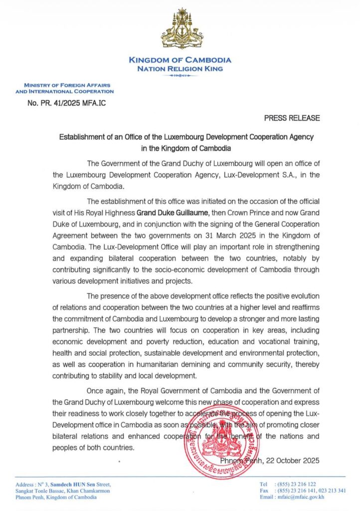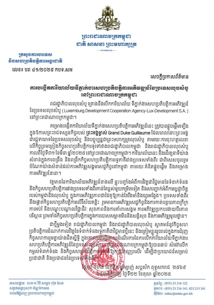 ភ្នំពេញ ៖ រាជរដ្ឋាភិបាលលុចសំបួ គ្រោងនឹងបើកការិយាល័យ ទីភ្នាក់ងារសហប្រតិបត្តិការអភិវឌ្ឍន៍ Istuin (Luxemburg Development Cooperation Agency-Lux-Development S.A.) នៅព្រះរាជាណាចក្រកម្ពុជា។