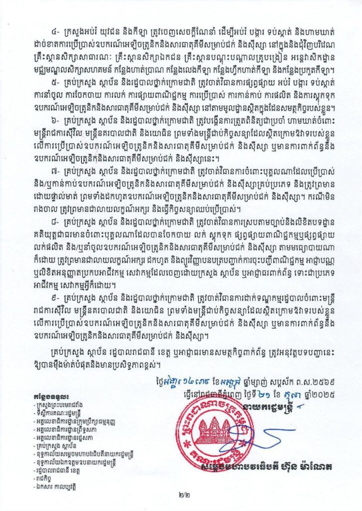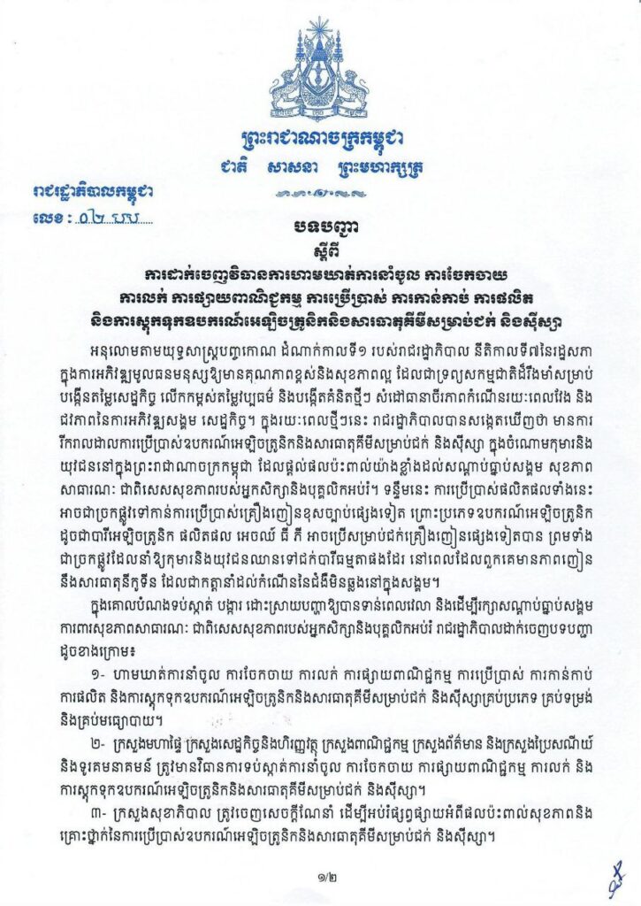 ភ្នំពេញ ៖ ប្រមុខរាជរដ្ឋាភិបាលកម្ពុជា សម្តេចមហាបវរធិបតី ហ៊ុន ម៉ាណែត បានចេញដាក់បទបញ្ជាហាមឃាត់ការនាំចូល ការចែកចាយ ការលក់ ការផ្សាយពាណិជ្ជកម្ម ការប្រើប្រាស់ ការកាន់កាប់ ការផលិត និងការស្តុកទុកឧបករណ៍អេឡិចត្រូនិក និងសារធាតុគីមីសម្រាប់ជក់ និងស៊ីស្សា គ្រប់ប្រភេទ និងគ្រប់ទម្រង់។
