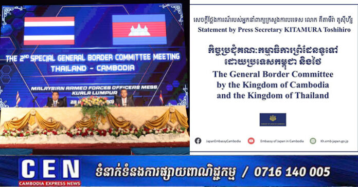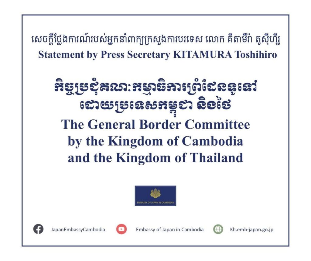 ១. រដ្ឋាភិបាលជប៉ុនសូមស្វាគមន៍ ចំពោះវឌ្ឍនភាពកិច្ចប្រជុំគណៈកម្មាធិការព្រំដែនទូទៅកម្ពុជា-ថៃ ដែលបានធ្វើឡើងនាថ្ងៃទី២៣ ខែតុលា នៅប្រទេសម៉ាឡេស៊ី ដែលបានពិភាក្សាអំពីការវិលត្រឡប់ទៅរកប្រក្រតីភាពឡើងវិញនៃទំនាក់ទំនងរវាងប្រទេសទាំងពីរ និងឯកភាពគ្នាលើការបង្កើតក្រុមសង្កេតការណ៍អាស៊ាន(AOT) ដែលជាការរួមចំណែកក្នុងការធ្វើឱ្យកិច្ចព្រមព្រៀងបទឈប់បាញ់កាន់តែមានភាពច្បាស់លាស់។