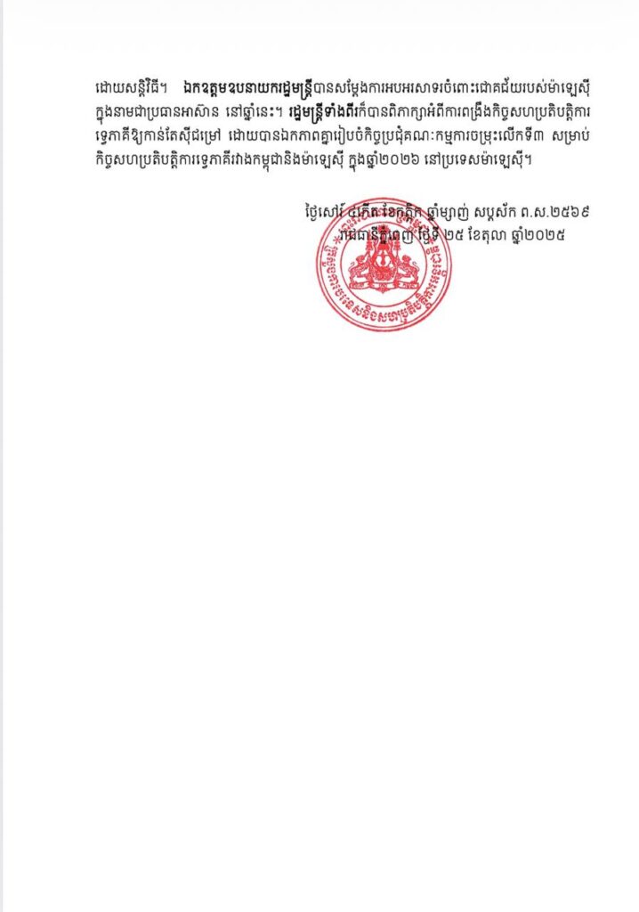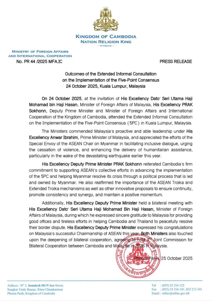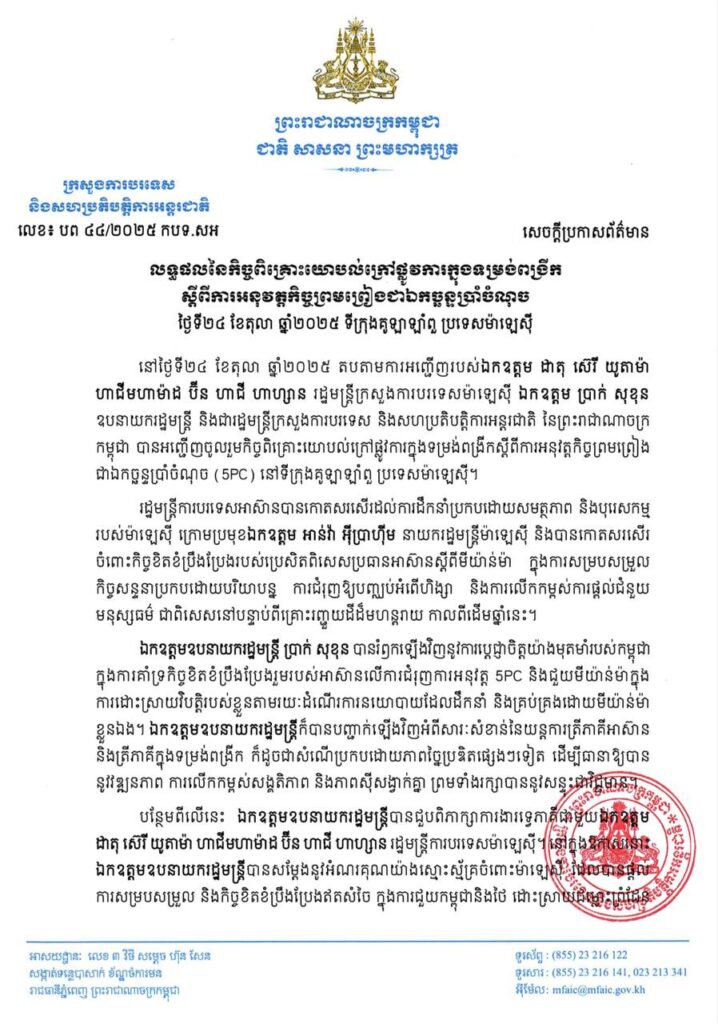 ក្រសួងការបរទេស និងសហប្រតិបត្តិការអន្តរជាតិ បានចេញសេចក្តីប្រកាសព័ត៌មានឲ្យដឹងថា នៅថ្ងៃទី២៤ ខែតុលា ឆ្នាំ២០២៥ តបតាមការអញ្ជើញរបស់ឯកឧត្តម ដាតុ ស៊េរី យូតាម៉ ហាជីមហាម៉ាដ ប៊ីន ហាជី ហាហ្សាន រដ្ឋមន្ត្រីក្រសួងការបរទេសម៉ាឡេស៊ី ឯកឧត្តម ប្រាក់ សុខុន ឧបនាយករដ្ឋមន្ត្រី និងជារដ្ឋមន្ត្រីក្រសួងការបរទេស និងសហប្រតិបត្តិការអន្តរជាតិ នៃព្រះរាជាណាចក្រ កម្ពុជា បានអញ្ជើញចូលរួមកិច្ចពិគ្រោះយោបល់ក្រៅផ្លូវការក្នុងទម្រង់ពង្រីកស្ដីពីការអនុវត្តកិច្ចព្រមព្រៀង ជាឯកច្ឆន្ទប្រាំចំណុច (5PC) នៅទីក្រុងគូឡាឡាំពួ ប្រទេសម៉ាឡេស៊ី។