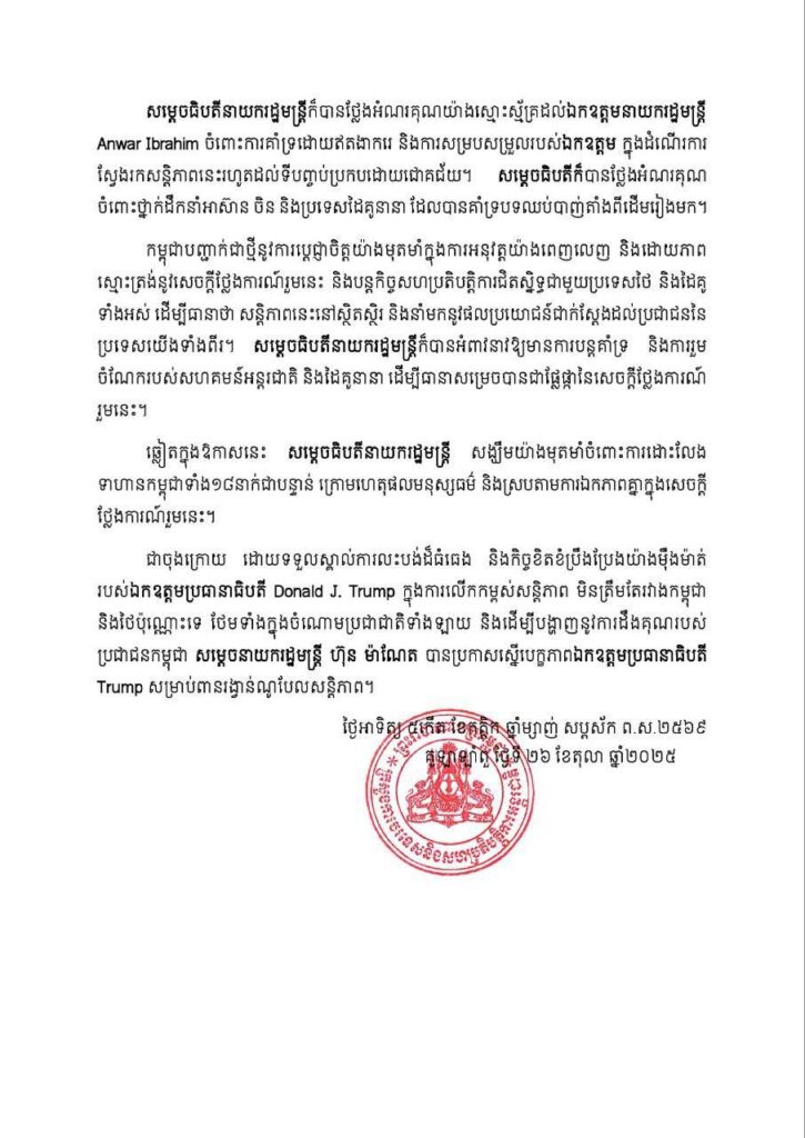 ដរាបណាប្រជាជាតិនានាមានសេចក្ដីក្លាហាន និងសុភវិនិច្ឆ័យក្នុងការបន្តស្វែងរកសន្តិភាពជាមួយគ្នា។ តាងនាមប្រជាជនកម្ពុជា សម្តេចធិបតីនាយករដ្ឋមន្ត្រី ហ៊ុន ម៉ាណែត បានថ្លែងអំណរគុណ យ៉ាងជ្រាលជ្រៅបំផុតចំពោះឯកឧត្តមប្រធានាធិបតី Donald J. Trump ក្នុងភាពជាអ្នកដឹកនាំដ៏ម៉ឹងម៉ាត់ និងការប្តេជ្ញាចិត្តយ៉ាងខ្ជាប់ខ្ជួនក្នុងការគាំទ្រសន្តិភាពជានិរន្តន៍រវាងកម្ពុជានិងថៃ និងចំពោះកិច្ចខិតខំរិ ប្រឹងប្រែងដោយមិនគិតពីការនឿយហត់ក្នុងការជួយធ្វើឱ្យសមិទ្ធផលនេះក្លាយជាការពិត។