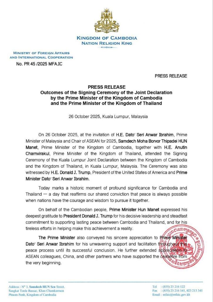 ទីក្រុងគូឡាឡាំពួ ៖ក្រសួងការបរទេស និងសហប្រតិបត្តិការអន្តរជាតិបានចេញសេចក្តីប្រកាសព័ត៌មានឲ្យដឹងថា នៅថ្ងៃទី២៦ ខែតុលា ឆ្នាំ២០២៥ តបតាមការអញ្ជើញរបស់ឯកឧត្តម Dato Seri Anwar Ibrahim នាយករដ្ឋមន្ត្រីម៉ាឡេស៊ី និងជាប្រធានអាស៊ានឆ្នាំ២០២៥ សម្តេចមហាបវរធិបតី ហ៊ុន ម៉ាណែត នាយករដ្ឋមន្ត្រីនៃព្រះរាជាណាចក្រកម្ពុជា រួមជាមួយនឹងឯកឧត្តម Anutin Chamvirakul នាយករដ្ឋមន្ត្រី នៃព្រះរាជាណាចក្រថៃ បានអញ្ជើញចូលរួមក្នុងពិធីចុះហត្ថលេខាលើសេចក្ដីថ្លែងការណ៍រួមទីក្រុងគូឡាឡាំពួ រវាងព្រះរាជាណាចក្រកម្ពុជា និងព្រះរាជាណាចក្រថៃ នៅទីក្រុងគូឡាឡាំពួ ប្រទេសម៉ាឡេស៊ី។ ពិធីនេះ ក៏មានការចូលរួមធ្វើជាសាក្សីពីឯកឧត្តម Donald J. Trump ប្រធានាធិបតីសហរដ្ឋអាម៉េរិក និង ឯកឧត្តម Dato’ Seri Anwar Ibrahim។