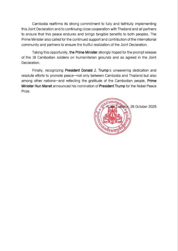 ជាចុងក្រោយ ដោយទទួលស្គាល់ការលះបង់ដ៏ធំធេង និងកិច្ចខិតខំប្រឹងប្រែងយ៉ាងម៉ឺងម៉ាត់ របស់ឯកឧត្តមប្រធានាធិបតី Donald J. Trump ក្នុងការលើកកម្ពស់សន្តិភាព មិនត្រឹមតែរវាងកម្ពុជា និងថៃប៉ុណ្ណោះទេ ថែមទាំងក្នុងចំណោមប្រជាជាតិទាំងឡាយ និងដើម្បីបង្ហាញនូវការដឹងគុណរបស់ ប្រជាជនកម្ពុជា សម្តេចនាយករដ្ឋមន្ត្រី ហ៊ុន ម៉ាណែត បានប្រកាសស្នើបេក្ខភាពឯកឧត្តមប្រធានាធិបតី Trump សម្រាប់ពានរង្វាន់ណូបែលសន្តិភាព៕ រក្សាសិទ្ធដោយ៖សុទ្ធលី