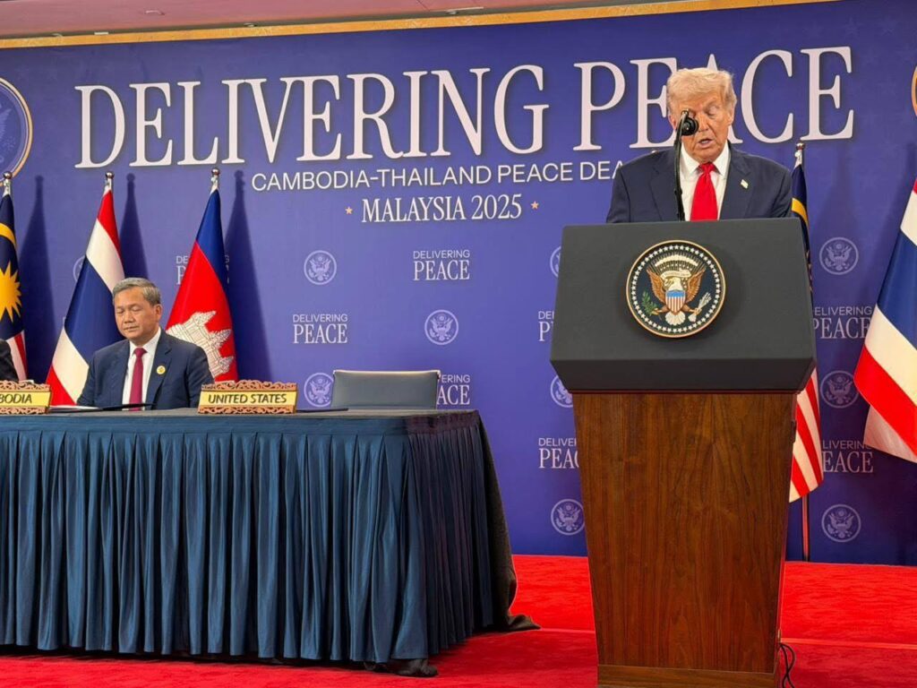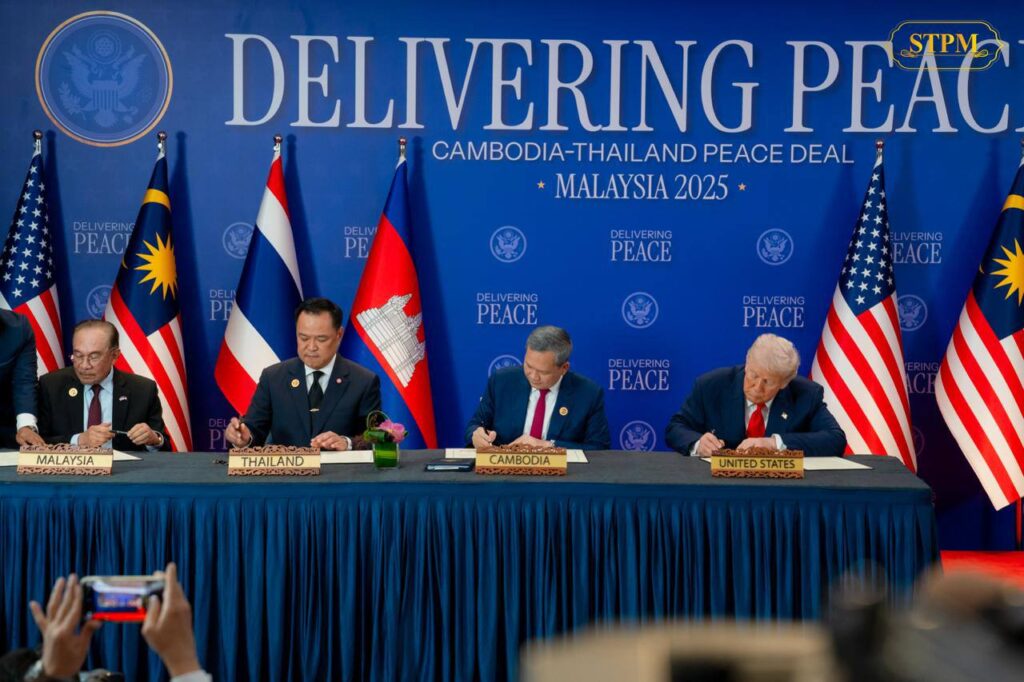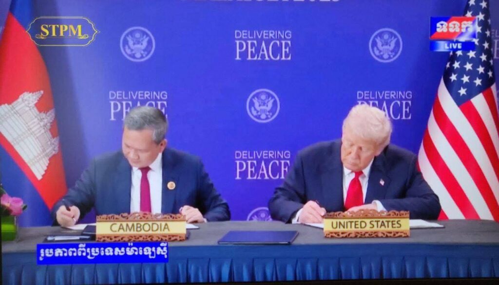 ១. «កិច្ចព្រមព្រៀងសន្តិភាព កម្ពុជា-ថៃ» ត្រូវបានចុះហត្ថលេខាដោយ សម្តេចមហាបវរធិបតី ហ៊ុន ម៉ាណែត នាយករដ្ឋមន្ត្រី នៃព្រះរាជាណាចក្រកម្ពុជា រួមជាមួយ ឯកឧត្តម Anutin Charnvirakul នាយករដ្ឋមន្ត្រី នៃព្រះរាជាណាចក្រថៃ ដោយមាន ឯកឧត្តម Donald J. Trump ប្រធានាធិបតី នៃសហរដ្ឋអាម៉េរិក រួមជាមួយ ឯកឧត្តម Anwar Ibrahim នាយករដ្ឋមន្ត្រី នៃប្រទេសម៉ាឡេស៊ី និងជាប្រធានអាស៊ាន ២០២៥ អញ្ជើញចុះហត្ថលេខាជាសាក្សី។