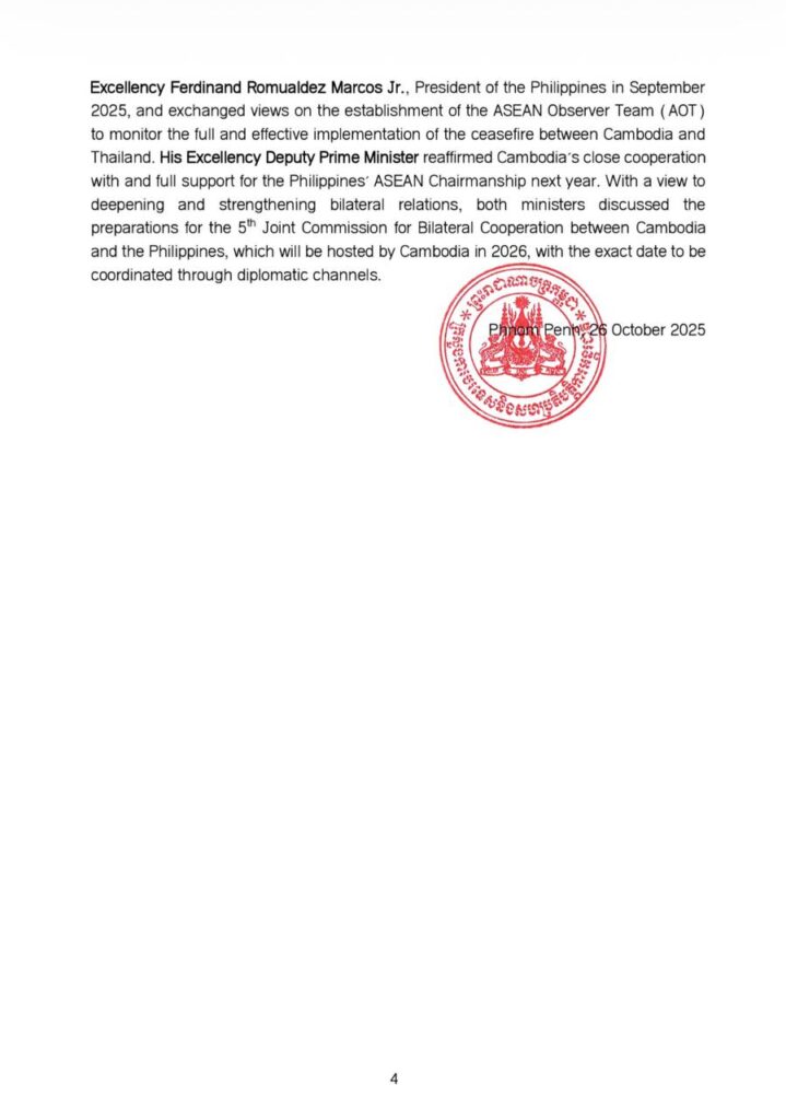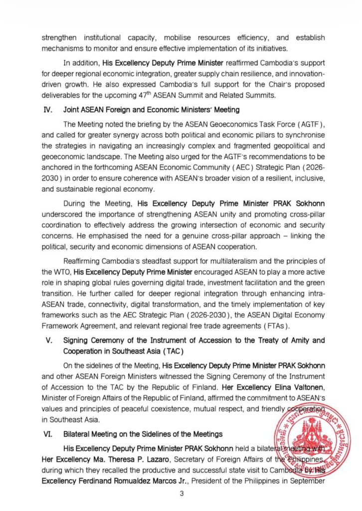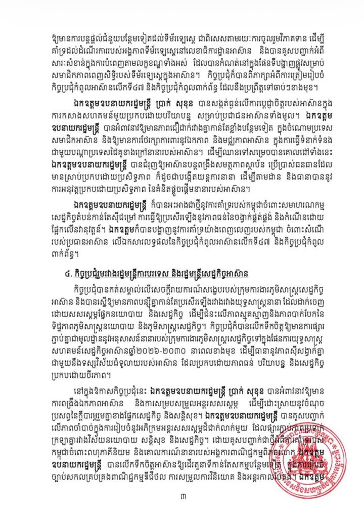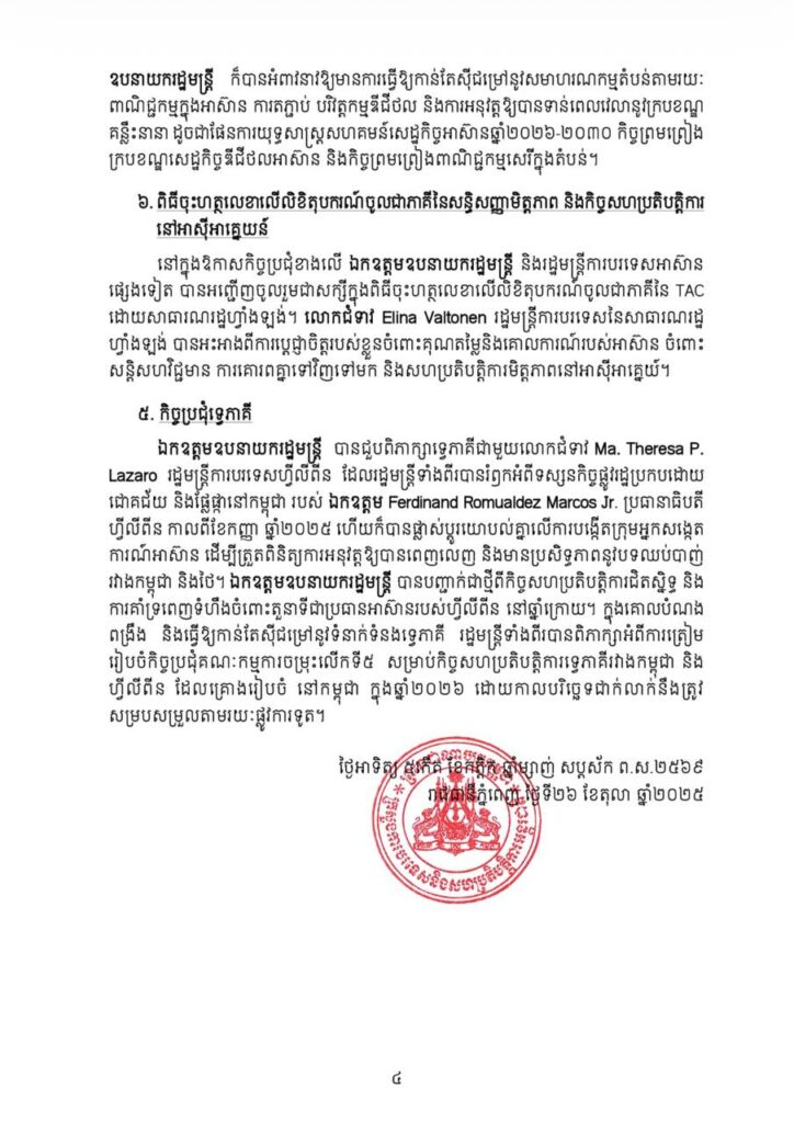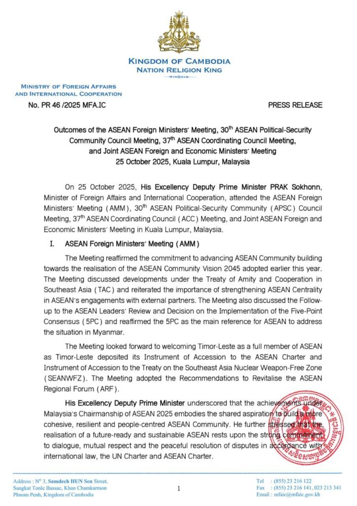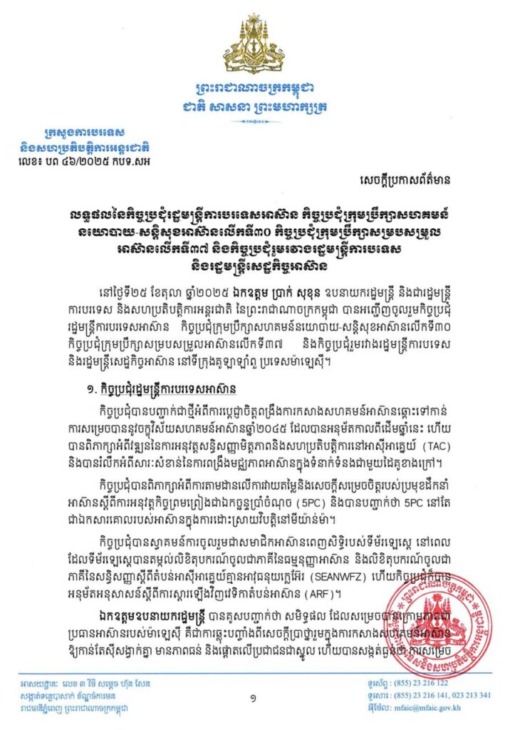 នៅថ្ងៃទី២៥ ខែតុលា ឆ្នាំ២០២៥ ឯកឧត្តម ប្រាក់ សុខុន ឧបនាយករដ្ឋមន្ត្រី និងជារដ្ឋមន្ត្រី ការបរទេស និងសហប្រតិបត្តិការអន្តរជាតិ នៃព្រះរាជាណាចក្រកម្ពុជា បានអញ្ជើញចូលរួមកិច្ចប្រជុំ រដ្ឋមន្ត្រីការបរទេសអាស៊ាន កិច្ចប្រជុំក្រុមប្រឹក្សាសហគមន៍នយោបាយ-សន្តិសុខអាស៊ានលើកទី៣០ កិច្ចប្រជុំក្រុមប្រឹក្សាសម្របសម្រួលអាស៊ានលើកទី៣៧ … និងកិច្ចប្រជុំរួមរវាងរដ្ឋមន្ត្រីការបទេស និងរដ្ឋមន្ត្រីសេដ្ឋកិច្ចអាស៊ាន នៅទីក្រុងគូឡាឡាំពួ ប្រទេសម៉ាឡេស៊ី។