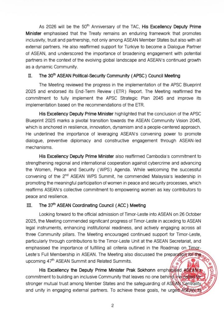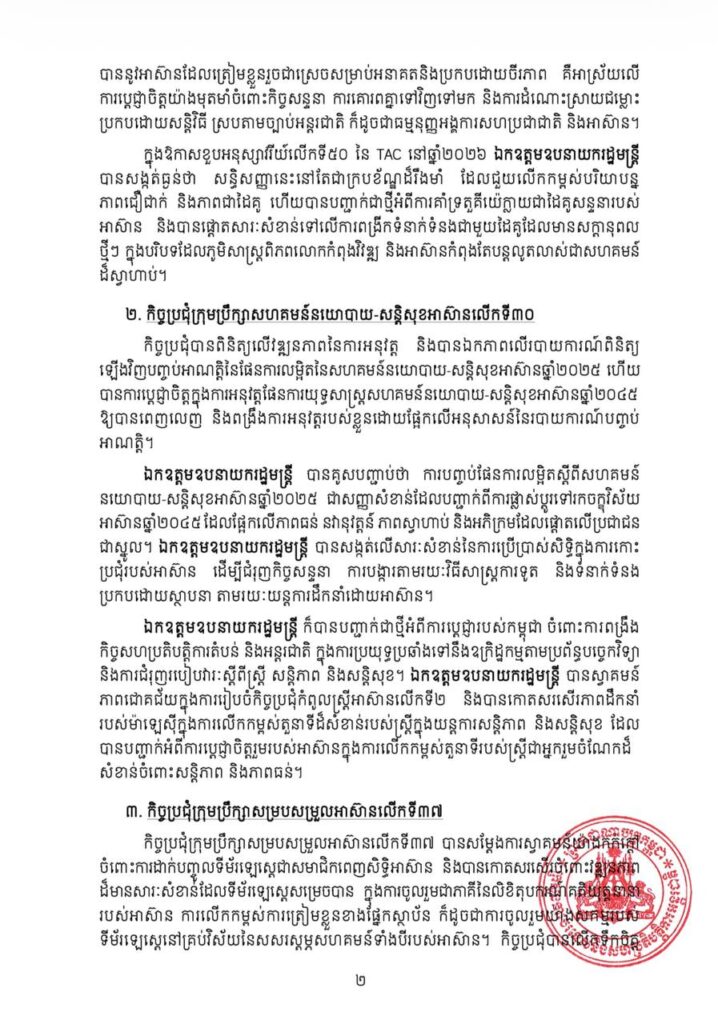 ឯកឧត្តមឧបនាយករដ្ឋមន្ត្រី បានគូសបញ្ជាប់ថា ការបញ្ចប់ផែនការលម្អិតស្តីពីសហគមន៍ នយោបាយ-សន្តិសុខអាស៊ានឆ្នាំ២០២៥ ជាសញ្ញាសំខាន់ដែលបញ្ជាក់ពីការផ្លាស់ប្តូរទៅរកចក្ខុវិស័យ អាស៊ានឆ្នាំ២០៤៥ ដែលផ្អែកលើភាពធន់ នវានុវត្តន៍ ភាពស្វាហាប់ និងអភិក្រមដែលផ្ដោតលើប្រជាជន ជាស្នូល។ ឯកឧត្តមឧបនាយករដ្ឋមន្ត្រី បានសង្កត់លើសារៈសំខាន់នៃការប្រើប្រាស់សិទ្ធិក្នុងការកោះ ប្រជុំរបស់អាស៊ាន ដើម្បីជំរុញកិច្ចសន្ទនា ការបង្ការតាមរយៈវិធីសាស្រ្តការទូត និងទំនាក់ទំនង ប្រកបដោយស្ថាបនា តាមរយៈយន្តការដឹកនាំដោយអាស៊ាន។