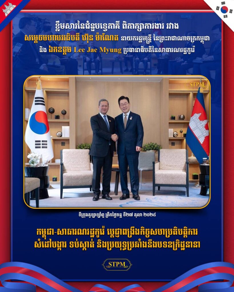 ទីក្រុងគូឡាឡាំពួ ៖ នាព្រឹកថ្ងៃទី២៧ ខែតុលា ឆ្នាំ២០២៥, សម្តេចមហាបវរធិបតី ហ៊ុន ម៉ាណែត នាយករដ្ឋមន្រ្តី នៃព្រះរាជាណាចក្រកម្ពុជា និង ឯកឧត្តម Lee Jae-Myung ប្រធានាធិបតីសាធារណរដ្ឋកូរ៉េ បានជួបពិភាក្សាការងារទ្វេភាគី ក្នុងឱកាសចូលរួមកិច្ចប្រជុំកំពូលអាស៊ាន លើកទី៤៧ និងកិច្ចប្រជុំកំពូលពាក់ព័ន្ធ នៅទីក្រុងគូឡាឡាំពួ ប្រទេសម៉ាឡេស៊ី នៅថ្ងៃទី២៦-២៨ ខែតុលា ឆ្នាំ២០២៥។