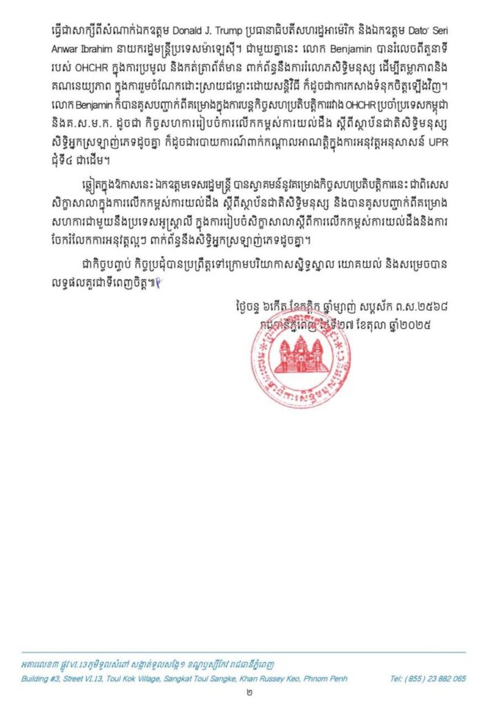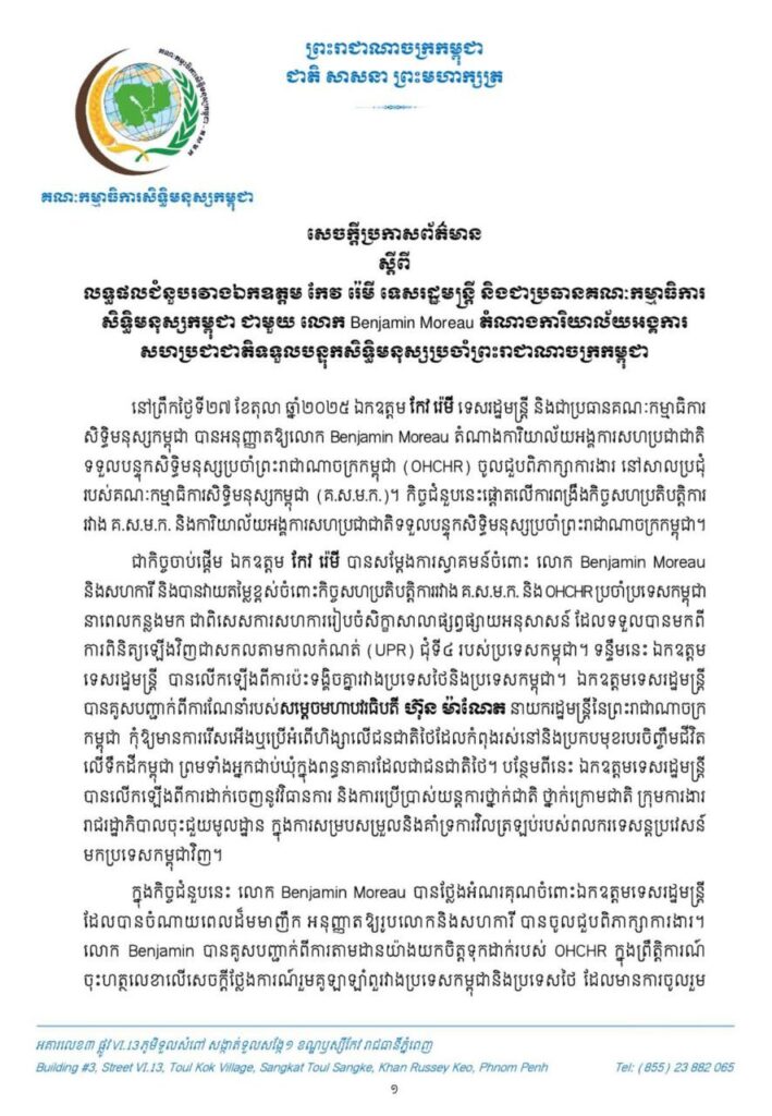 ក្នុងកិច្ចជំនួបនេះ លោក Benjamin Moreau បានថ្លែងអំណរគុណចំពោះឯកឧត្តមទេសរដ្ឋមន្តី ដែលបានចំណាយពេលដ៏មមាញឹក អនុញ្ញាតឱ្យរូបលោកនិងសហការី បានចូលជួបពិភាក្សាការងារ។ លោក Benjamin បានគូសបញ្ជាក់ពីការតាមដានយ៉ាងយកចិត្តទុកដាក់របស់ OHCHR ក្នុងព្រឹត្តិការណ៍ ចុះហត្ថលេខាលើសេចក្ដីថ្លែងការណ៍រួមគូឡាឡាំពួរវាងប្រទេសកម្ពុជានិងប្រទេសថៃ ដែលមានការចូលរួមធ្វើជាសាក្សីពីសំណាក់ឯកឧត្តម Donald J. Trump ប្រធានាធិបតីសហរដ្ឋអាម៉េរិក និងឯកឧត្តម Dato Seri Anwar Ibrahim នាយករដ្ឋមន្ត្រីប្រទេសម៉ាឡេស៊ី។
