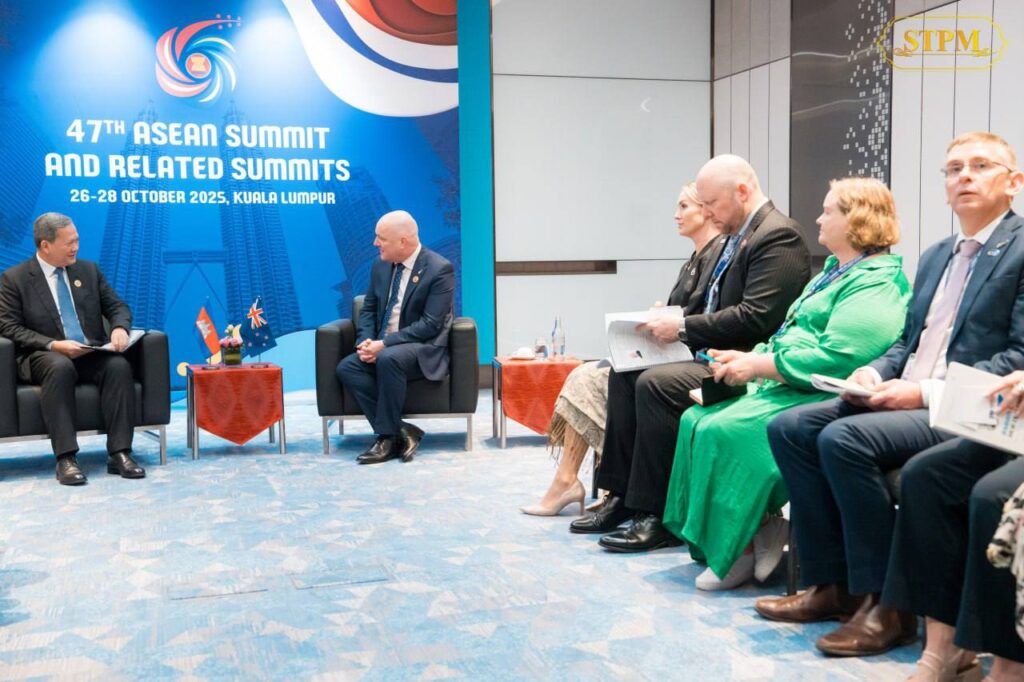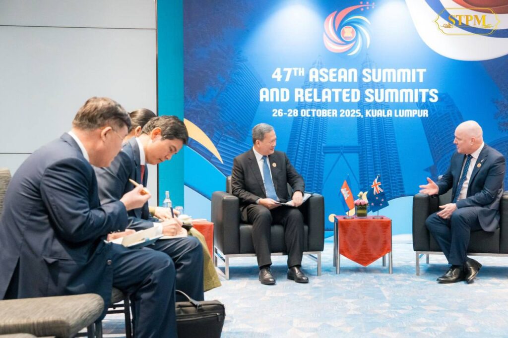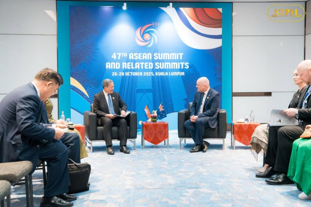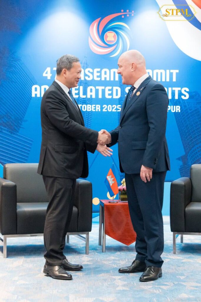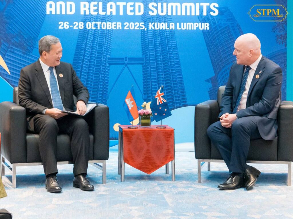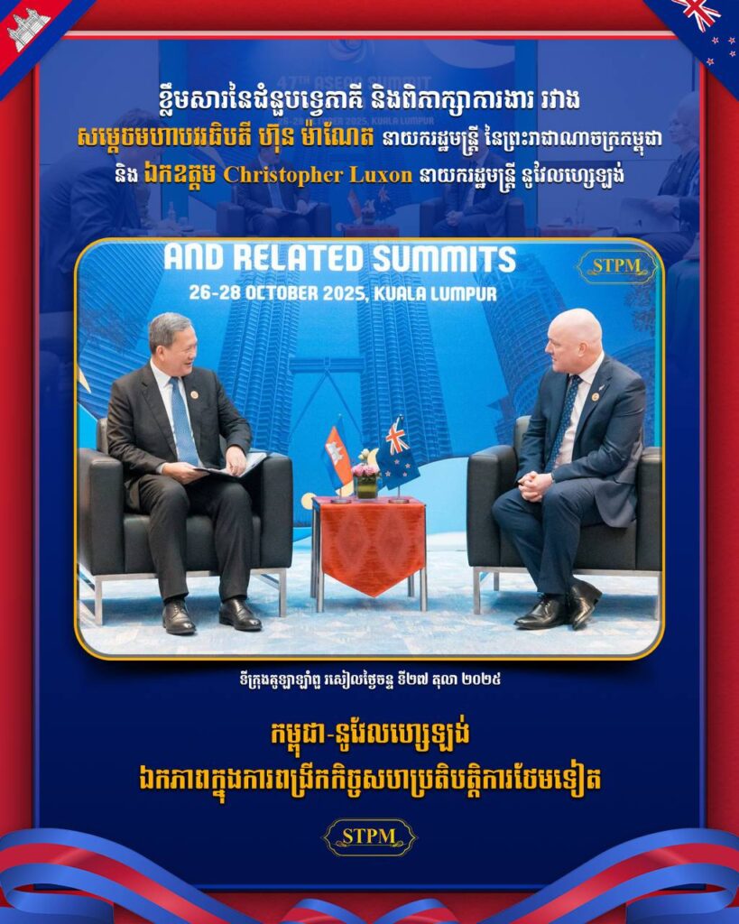 នាព្រឹកថ្ងៃទី២៧ ខែតុលា ឆ្នាំ២០២៥, សម្តេចមហាបវរធិបតី ហ៊ុន ម៉ាណែត នាយករដ្ឋមន្រ្តី នៃព្រះរាជាណាចក្រកម្ពុជា និង ឯកឧត្តម Christopher Luxon នាយករដ្ឋមន្ត្រី នូវែលហ្សេឡង់ បានជួបពិភាក្សាការងារទ្វេភាគី ក្នុងឱកាសចូលរួមកិច្ចប្រជុំកំពូលអាស៊ាន លើកទី៤៧ និងកិច្ចប្រជុំកំពូលពាក់ព័ន្ធ នៅទីក្រុងគូឡាឡាំពួ ប្រទេសម៉ាឡេស៊ី នៅថ្ងៃទី២៦-២៨ ខែតុលា ឆ្នាំ២០២៥។