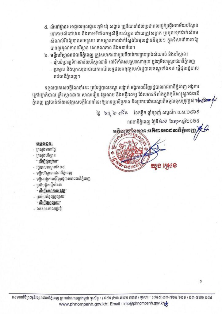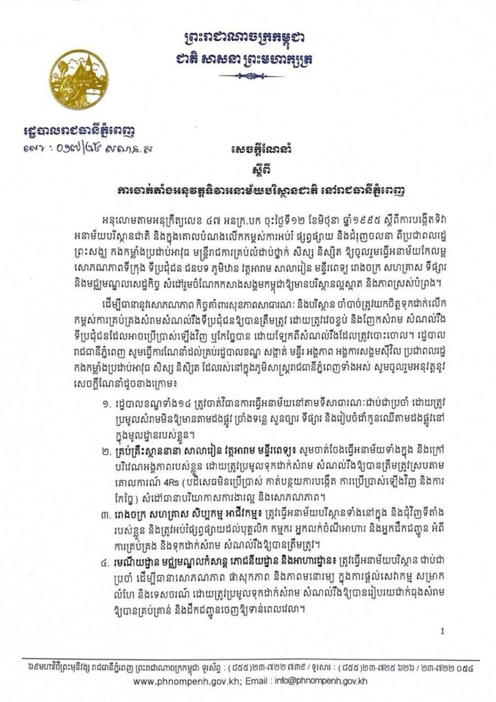 ១. រដ្ឋបាលខណ្ឌទាំង១៤ ត្រូវចាត់វិធានការធ្វើអនាម័យនៅតាមទីសាធារណៈជាប់ជាប្រចាំ ដោយត្រូវ ប្រមូលសំរាមមិនឱ្យមានតាមដងផ្លូវ ច្រាំងទន្លេ សួនច្បារ ទីផ្សារ និងរៀបចំដាំកូនឈើតាមដងផ្លូវនៅ ក្នុងមូលដ្ឋានរបស់ខ្លួន។