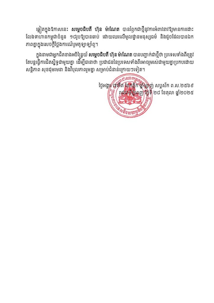 ក្នុងនាមជាអ្នកជិតខាងអចិន្ត្រៃយ៍ សម្ដេចធិបតី ហ៊ុន ម៉ាណែត បានបញ្ជាក់ជាថ្មីថា ប្រទេសទាំងពីរត្រូវ តែបន្តធ្វើការជិតស្និទ្ធជាមួយគ្នា ដើម្បីធានាថា ប្រជាជននៃប្រទេសទាំងពីរអាចរួមរស់ជាមួយគ្នាប្រកបដោយ សន្តិភាព សុខដុមរមនា និងវិបុលភាពរួមគ្នា សម្រាប់ជំនាន់ក្រោយៗទៀត៕ រក្សាសិទ្ធដោយ៖សុទ្ធលី