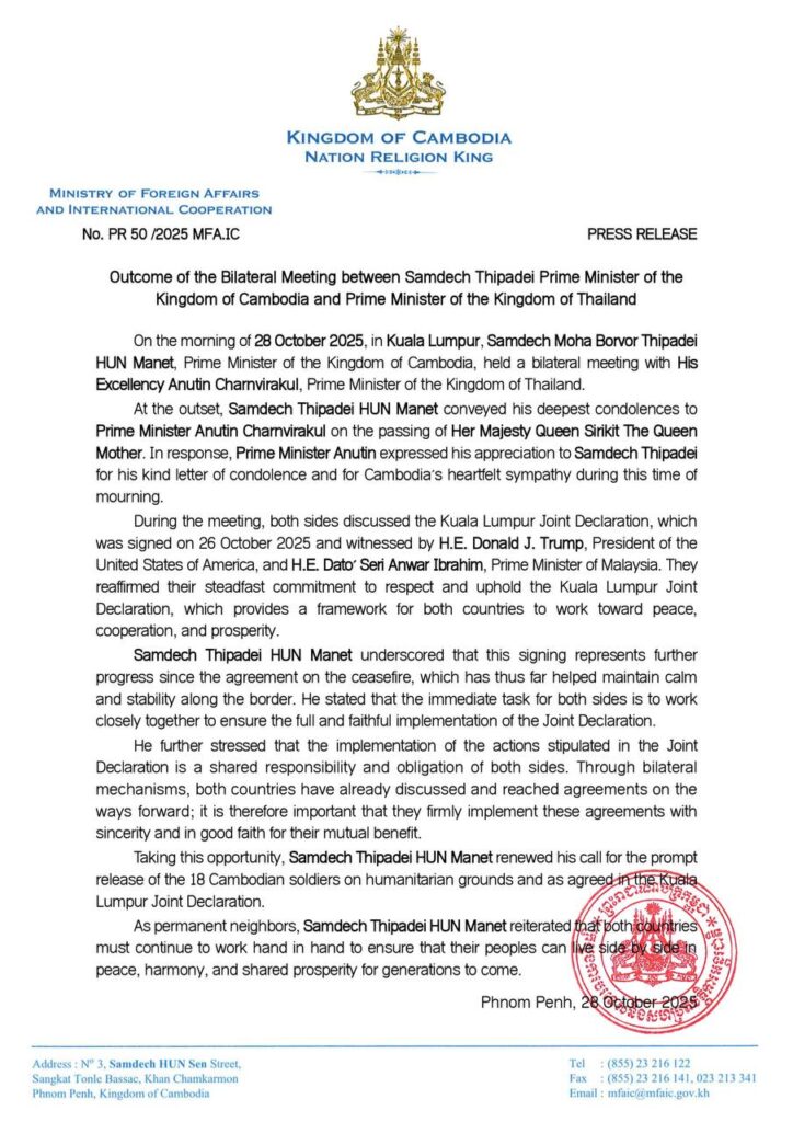 រាជធានីភ្នំពេញ ៖ នៅថ្ងៃទី ២៨ ខែតុលា ឆ្នាំ២០២៥ ក្រសួងការបរទេស និងសហប្រតិបត្តិការអន្តរជាតិ បានចេញសេចក្តីប្រកាសព័ត៌មានស្តីពីលទ្ធផលនៃជំនួបទ្វេភាគីរវាងសម្ដេចធិបតីនាយករដ្ឋមន្ត្រីនៃព្រះរាជាណាចក្រកម្ពុជា និងនាយករដ្ឋមន្ត្រីនៃព្រះរាជាណាចក្រថៃ។