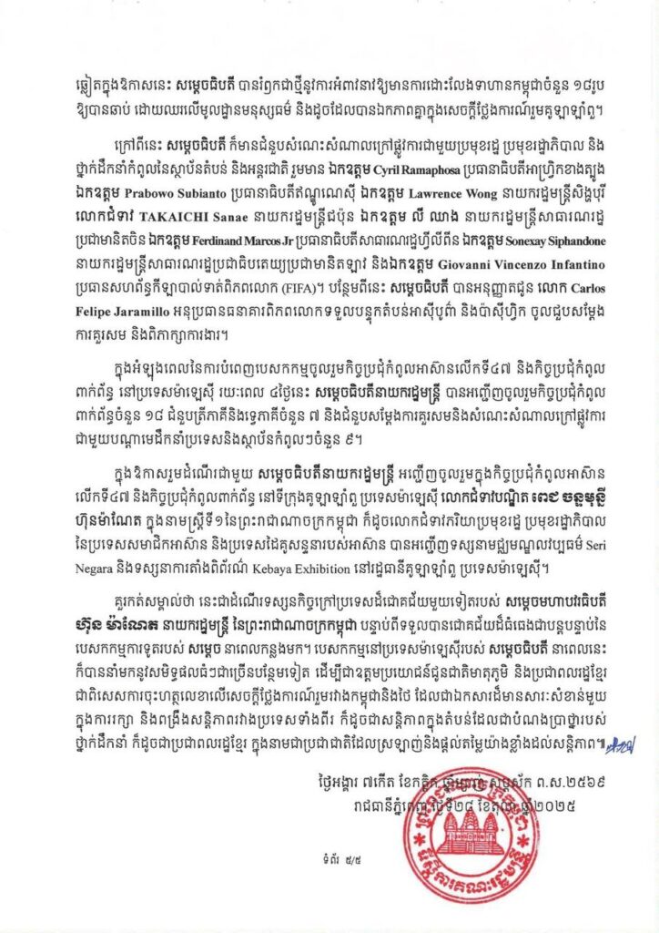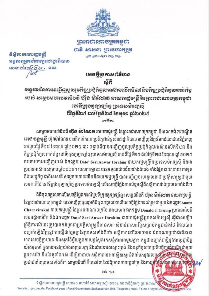 ពិធីចុះហត្ថលេខាលើសេចក្ដីថ្លែងការណ៍រួមទីក្រុងគូឡាឡាំពួ៖ សម្តេចធិបតី ហ៊ុន ម៉ាណែត នាយករដ្ឋមន្ត្រី នៃព្រះរាជាណាចក្រកម្ពុជា បានអញ្ជើញចូលរួមពិធីចុះហត្ថលេខាលើសេចក្ដីថ្លែងការណ៍រួម ជាមួយ ឯកឧត្តម Anutin Charnvirakul នាយករដ្ឋមន្ត្រី នៃព្រះរាជាណាចក្រថៃ ដោយមាន ឯកឧត្តម Donald J. Trump ប្រធានាធិបតី សហរដ្ឋអាម៉េរិក និងឯកឧត្តម Dato’ Seri Anwar Ibrahim នាយករដ្ឋមន្ត្រីប្រទេសម៉ាឡេស៊ី ធ្វើជាសាក្សី។