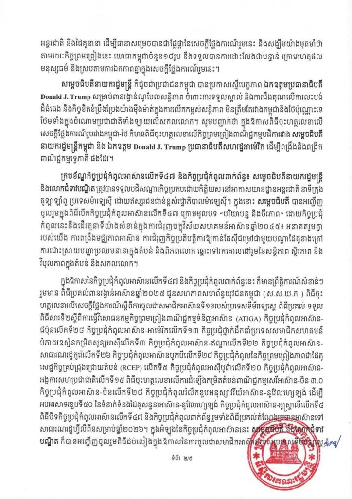 សម្តេចធិបតីនាយករដ្ឋមន្ត្រី ក៏ដូចជាប្រជាជនកម្ពុជា បានប្រកាសស្នើបេក្ខភាព ឯកឧត្តមប្រធានាធិបតី Donald J. Trump សម្រាប់ពានរង្វាន់ណូបែលសន្តិភាព ចំពោះការទទួលស្គាល់ និងការដឹងគុណលើការលះបង់ ដ៏ធំធេង និងកិច្ចខិតខំប្រឹងប្រែងយ៉ាងម៉ឺងម៉ាត់ក្នុងការលើកកម្ពស់សន្តិភាព មិនត្រឹមតែរវាងកម្ពុជានិងថៃប៉ុណ្ណោះទេ ថែមទាំងក្នុងចំណោមប្រជាជាតិទាំងឡាយលើសកលលោក។ សូមបញ្ជាក់ថា ក្នុងឱកាសពិធីចុះហត្ថលេខាលើ សេចក្ដីថ្លែងការណ៍រួមរវាងកម្ពុជា-ថៃ ក៏មានពិធីចុះហត្ថលេខាលើកិច្ចព្រមព្រៀងពាណិជ្ជកម្មបដិការរវាង សម្ដេចធិបតី នាយករដ្ឋមន្ត្រីកម្ពុជា និង ឯកឧត្តម Donald J. Trump ប្រធានាធិបតីសហរដ្ឋអាមេរិក ដើម្បីពង្រឹងនិងពង្រីក ពាណិជ្ជកម្មទ្វេភាគី ផងដែរ។