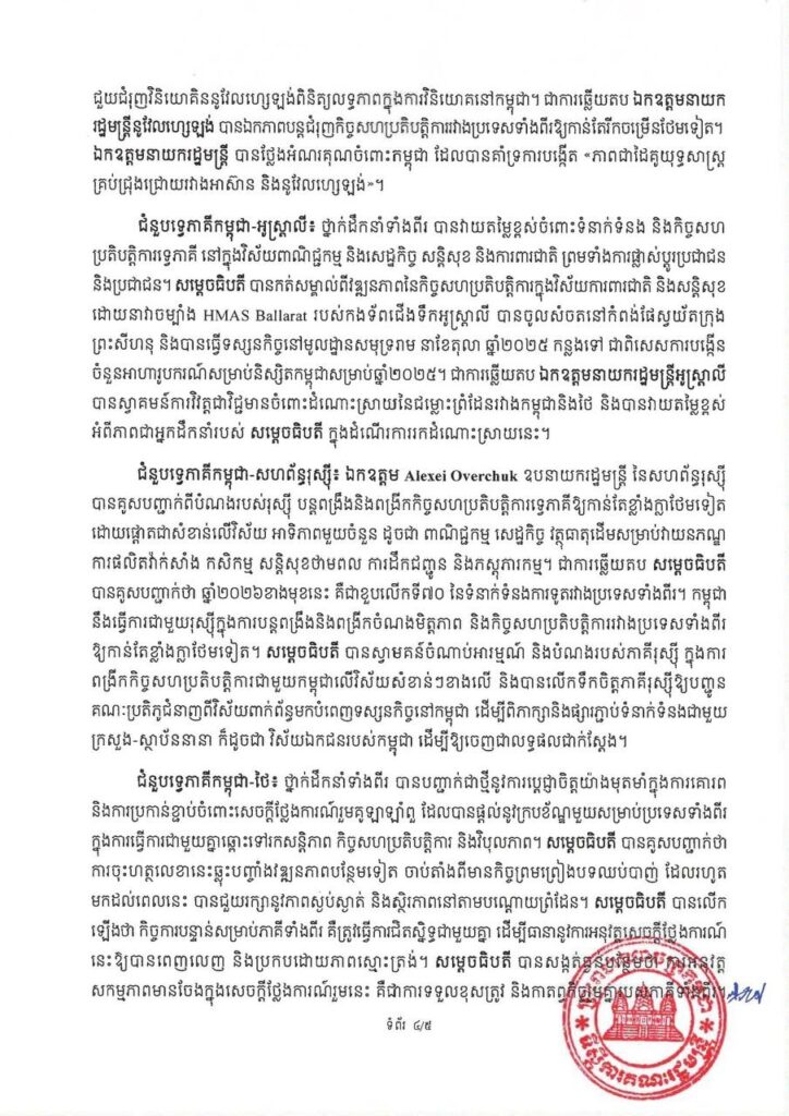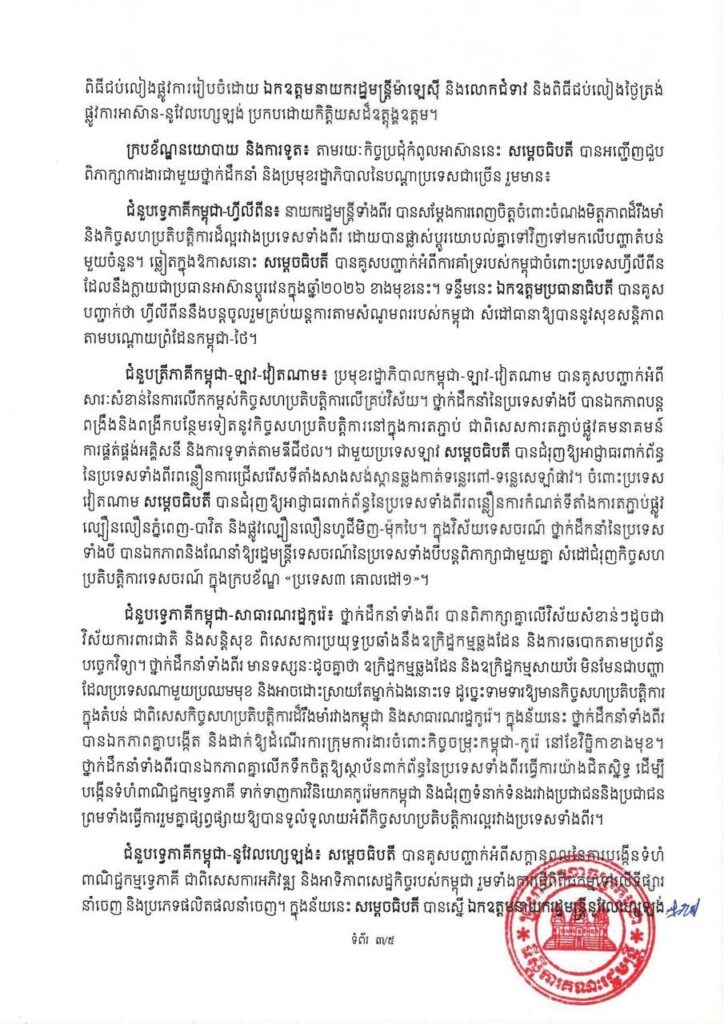 ព្រឹត្តិការណ៍នេះត្រូវបានកត់ត្រាជាប្រវត្តិសាស្ត្រដ៏មានសារៈសំខាន់ជាសារវ័ន្តសម្រាប់កម្ពុជានិងថៃ ដែលបាន បញ្ជាក់ឡើងវិញនូវការជឿជាក់រួមគ្នានៃប្រទេសទាំងពីរថា សន្តិភាពនៅតែអាចមាន ដរាបណាប្រជាជាតិនានា មានសេចក្តីក្លាហាន និងសុភវិនិច្ឆ័យក្នុងការបន្តស្វែងរកសន្តិភាពជាមួយគ្នា។ កម្ពុជាបញ្ជាក់ជាថ្មីនូវការប្ដេជ្ញាចិត្ត យ៉ាងមុតមាំ ក្នុងការអនុវត្តយ៉ាងពេញលេញ និងដោយភាពស្មោះត្រង់ និងបន្តកិច្ចសហប្រតិបត្តិការជិតស្និទ្ធជាមួយ ប្រទេសថៃ និងដៃគូទាំងអស់ ដើម្បីធានាថា សន្តិភាពនេះនៅស្ថិតស្ថេរ និងនាំមកនូវផលប្រយោជន៏ដាក់ស្តង់ដល់ ប្រជាជននៃប្រទេសទាំងពីរ។ សម្តេចធិបតី ក៏បានអំពាវនាវឱ្យមានការបន្តគាំទ្រ និងការរួមចំណែករបស់សហគមន៍អន្តរជាតិ និងដៃគូនានា ដើម្បីធានាសម្រេចបានជាផ្លែផ្កានៃសេចក្តីថ្លែងការណ៍រួមនេះ និងសង្ឃឹមយ៉ាងមុតមាំថា តាមរយៈកិច្ចព្រមព្រៀងនេះ យោធាកម្ពុជាចំនួន១៨រូប នឹងទទួលបានការដោះលែងជាបន្ទាន់ ក្រោមហេតុផល មនុស្សធម៌ និងស្របតាមការឯកភាពគ្នាក្នុងសេចក្ដីថ្លែងការណ៍រួមនេះ។