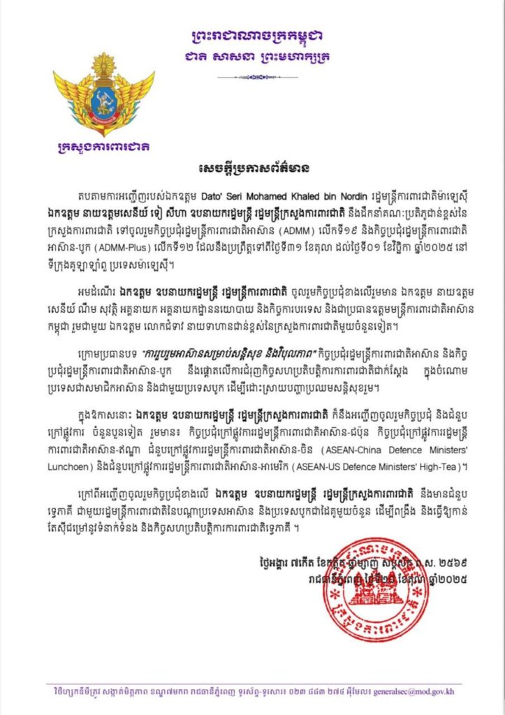 ភ្នំពេញ ៖ ឯកឧត្តម នាយឧត្តមសេនីយ៍ ទៀ សីហា ឧបនាយករដ្ឋមន្រ្តី រដ្ឋមន្ត្រីក្រសួងការពារជាតិ នឹងដឹកនាំគណៈប្រតិភូជាន់ខ្ពស់ក្រសួងការពារជាតិ ទៅចូលរួមកិច្ចប្រជុំរដ្ឋមន្ត្រីការពារជាតិអាស៊ាន (ADMM) លើកទី១៩ និងកិច្ចប្រជុំរដ្ឋមន្ត្រីការពារជាតិអាស៊ាន-បូក (ADMM-Plus) លើកទី១២ ដែលនឹងប្រព្រឹត្តទៅចាប់ពីថ្ងៃទី៣១ ខែតុលា ដល់ថ្ងៃទី១ ខែវិច្ឆិកា ឆ្នាំ២០២៥ នៅទីក្រុងកូឡាឡាំពួរ ប្រទេសម៉ាឡេស៊ី។