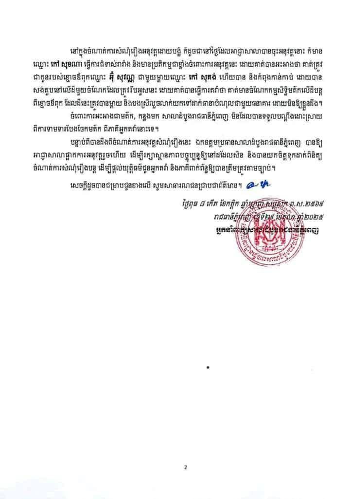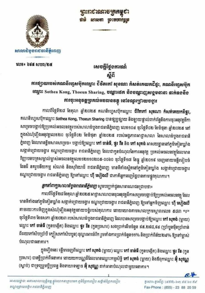 ភ្នំពេញ ៖ សាលាដំបូងរាជធានីភ្នំពេញ នាថ្ងៃទី២៩ ខែតុលា ឆ្នាំ២០២៥នេះ បានចេញសេចក្តីថ្លែងការណ៍ពាក់ព័ន្ធការចុះរឹបអូសផ្ទះស្រ្តីម្នាក់នៅខណ្ឌជ្រោយចង្វារ ដែលនាំឲ្យមានការចែកចាយព័ត៌មាននៅលើបណ្តាញសង្គមពីស្រ្តីម្នាក់ដែលអះអាងខ្លួនថាជាកូននិងជាម្ចាស់សហកម្មសិទ្ធិលើដីដែលម្តាយនិងបងស្រីរបស់ខ្លួនបានលួចយកប្លង់ដីទៅដាក់នៅធនគារ ក្រោយពេលឪពុកស្លាប់ ដែលអាជ្ញាសាលាបាននិងកំពុងចុះអនុវត្តរឹបអូសផ្ទះដើម្បីយកប្រគល់ឲ្យបុគ្គលម្នាក់ទៀត ជាភាគីអ្នកដេញថ្លៃបានតាមផ្លូវតុលាការ។ ពាក់ព័ន្ធនឹងការតវ៉ាយ៉ាងខ្លាំងបែបនេះ ប្រធានតុលាការបញ្ជាឲ្យផ្អាកការអនុវត្ត និងឲ្យពិនិត្យឡើងវិញ ដើម្បីផ្តល់យុត្តិធម៌ដល់អ្នកតវ៉ា។