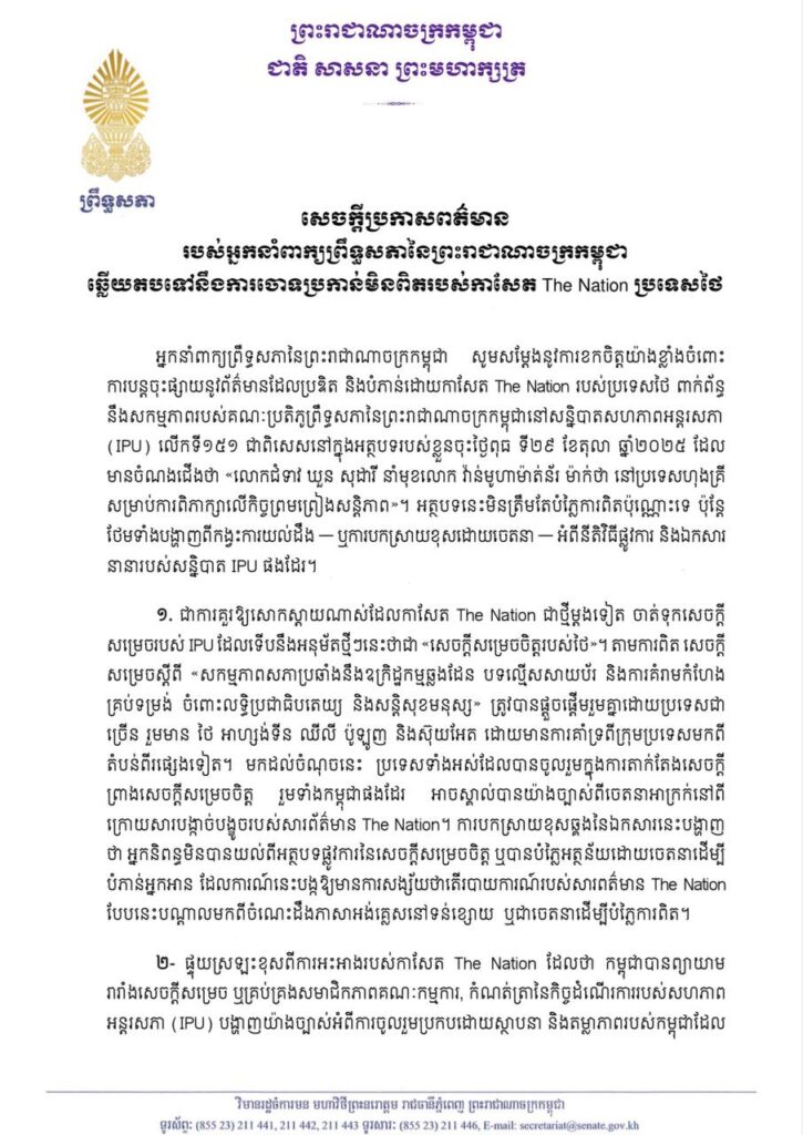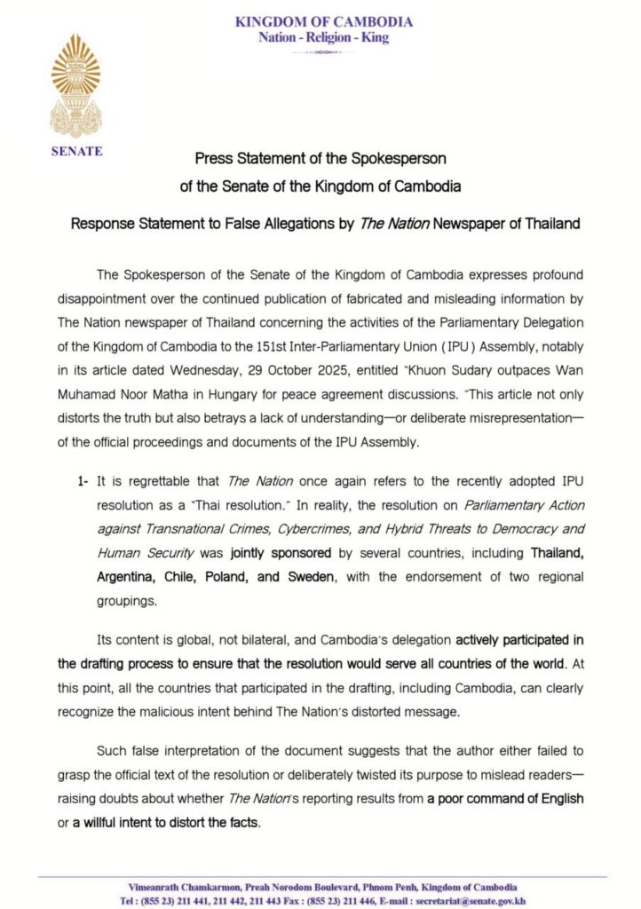 អ្នកនាំពាក្យព្រឹទ្ធសភានៃព្រះរាជាណាចក្រកម្ពុជា សូមសម្តែងនូវការខកចិត្តយ៉ាងខ្លាំងចំពោះ ការបន្តចុះផ្សាយនូវព័ត៌មានដែលប្រឌិត និងបំភាន់ដោយកាសែត The Nation របស់ប្រទេសថៃ ពាក់ព័ន្ធ នឹងសកម្មភាពរបស់គណៈប្រតិភូព្រឹទ្ធសភានៃព្រះរាជាណាចក្រកម្ពុជានៅសន្និបាតសហភាពអន្តរសភា (IPU) លើកទី១៥១ ជាពិសេសនៅក្នុងអត្ថបទរបស់ខ្លួនចុះថ្ងៃពុធ ទី២៩ ខែតុលា ឆ្នាំ២០២៥ ដែល មានចំណងជើងថា «លោកជំទាវ ឃួន សុដារី នាំមុខលោក វ៉ាន់មូហាម៉ាត់ន័រ ម៉ាក់ថា នៅប្រទេសហុងគ្រី សម្រាប់ការពិភាក្សាលើកិច្ចព្រមព្រៀងសន្តិភាព»។ អត្ថបទនេះមិនត្រឹមតែបំភ្លៃការពិតប៉ុណ្ណោះទេ ប៉ុន្ត ថែមទាំងបង្ហាញពីកង្វះការយល់ដឹង — ឬការបកស្រាយខុសដោយចេតនា — អំពីនីតិវិធីផ្លូវការ និងឯកសារ នានារបស់សន្និបាត IPU ផងដែរ។