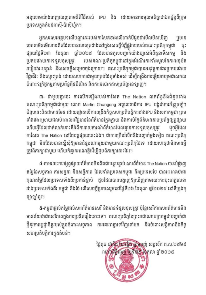៤-តាមរយៈការផ្សព្វផ្សាយព័ត៌មានមិនពិតជាបន្តបន្ទាប់ សារព័ត៌មាន The Nation បានបំផ្លាញ តម្លៃនៃសច្ចភាព ការសន្ទនា និងសន្តិភាព ដែលទាំងប្រទេសកម្ពុជា និងប្រទេសថៃ បានអះអាងថាជា គុណតម្លៃដែលប្រទេសទាំងពីរប្រកាន់ខ្ជាប់ ដូចដែលបានបង្ហាញឱ្យឃើញតាមរយៈការចុះហត្ថលេខា រវាងប្រទេសទាំងពីរ កម្ពុជា និងថៃ លើសេចក្តីប្រកាសរួមនៅថ្ងៃទី២៦ ខែតុលា ឆ្នាំ២០២៥ នៅទីក្រុងកូឡាឡាំពួរ។