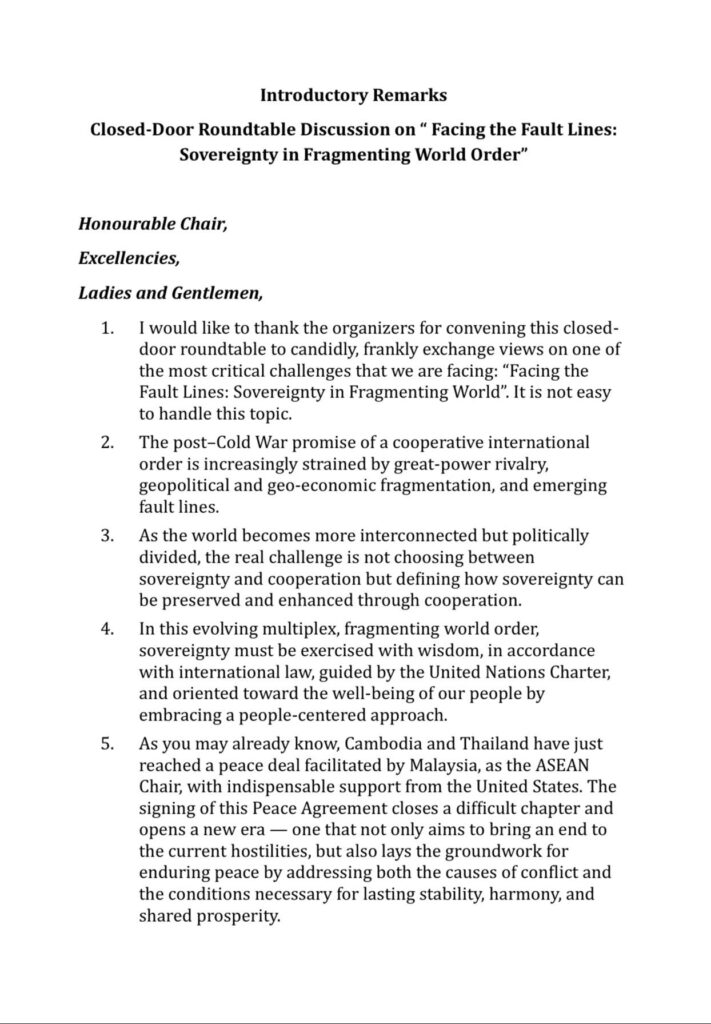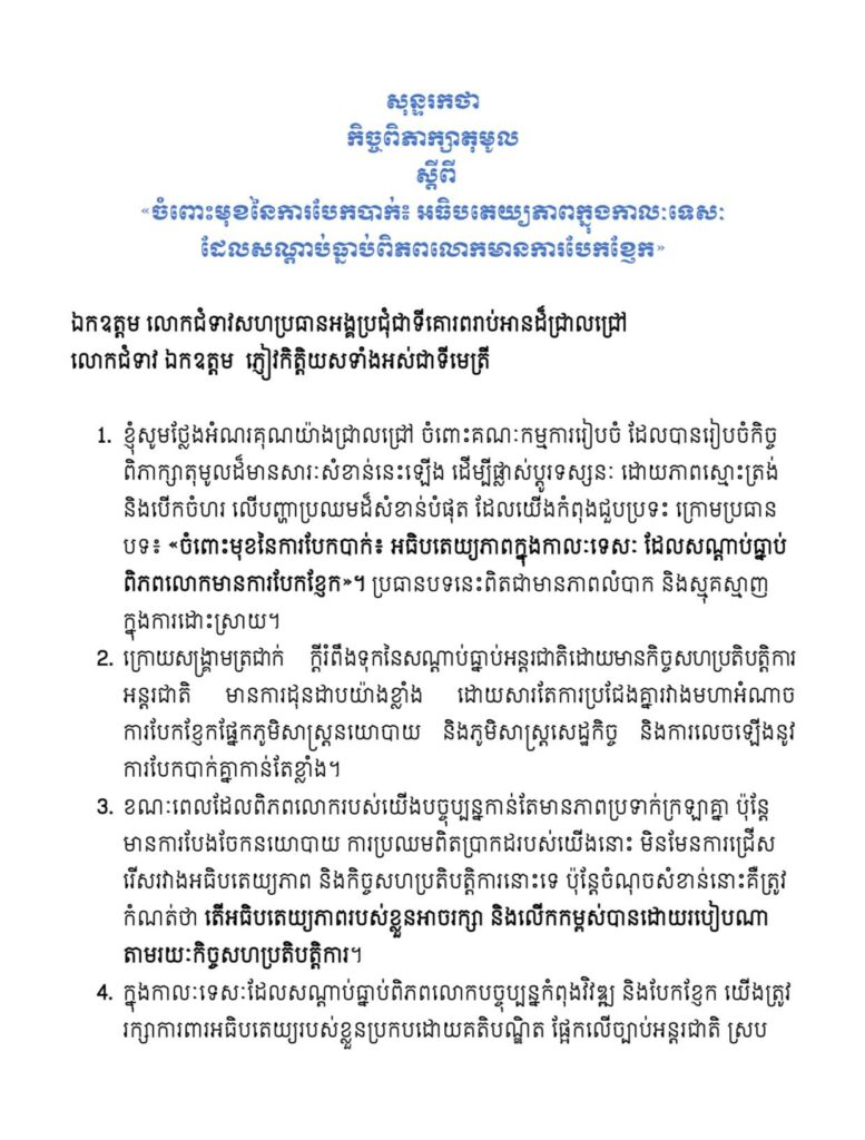 សម្តេចមហារដ្ឋសភាធិការធិបតី ឃួន សុដារី ប្រធានរដ្ឋសភា នៃព្រះរាជាណាចក្រកម្ពុជា បានថ្លែងអំណរគុណយ៉ាងជ្រាលជ្រៅ ចំពោះគណៈកម្មការរៀបចំ ដែលបានរៀបចំកិច្ច ពិភាក្សាតុមូលដ៏មានសារៈសំខាន់នេះឡើង ដើម្បីផ្លាស់ប្តូរទស្សនៈ ដោយភាពស្មោះត្រង់ និងបើកចំហរ លើបញ្ហាប្រឈមដ៏សំខាន់បំផុត ដែលយើងកំពុងជួបប្រទះ ក្រោមប្រធាន បទ៖ «ចំពោះមុខនៃការបែកបាក់៖ អធិបតេយ្យភាពក្នុងកាលៈទេសៈ ដែលសណ្ដាប់ធ្នាប់ ពិភពលោកមានការបែកខ្ញែក»។ ប្រធានបទនេះពិតជាមានភាពលំបាក និងស្មុគស្មាញ ក្នុងការដោះស្រាយ។