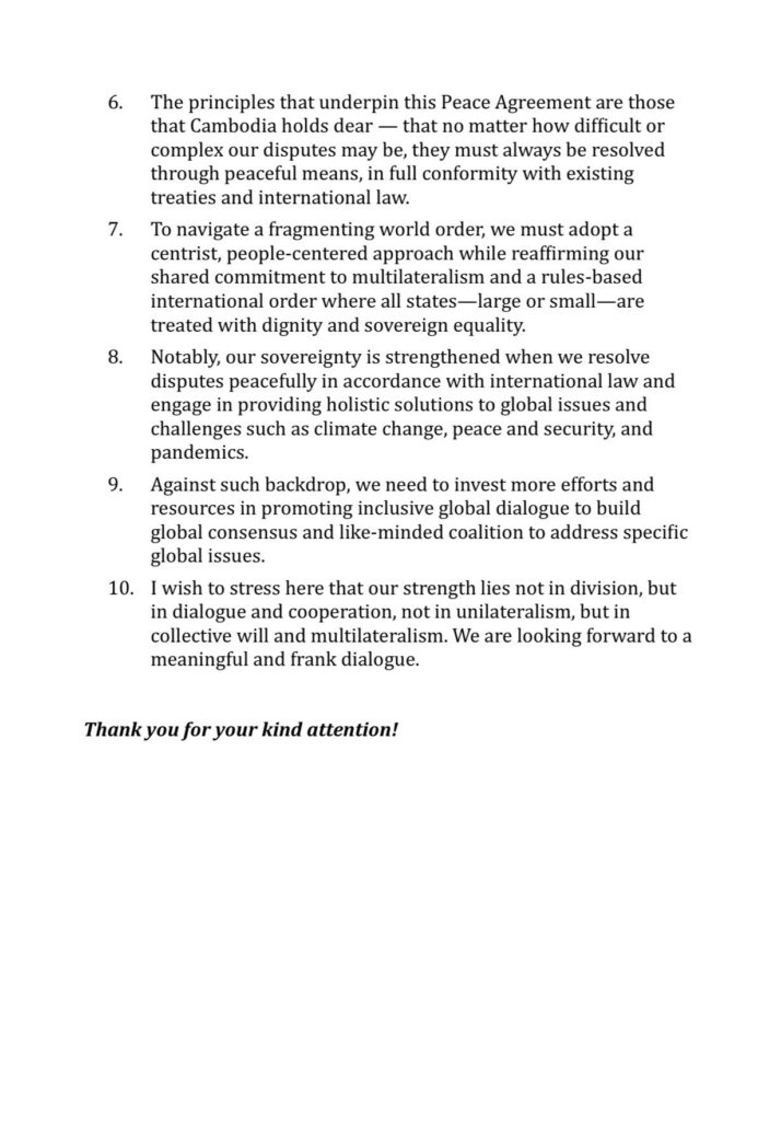 សម្តេចបានថ្លែងបន្តទៀតថា ដូចកិច្ចពិភាក្សាទាំងមូលដឹងហើយថា កម្ពុជា-ថៃបានឯកភាពគ្នាលើកិច្ចព្រមព្រៀងសន្តិភាព ដោយមានការជួយសម្របសម្រួលពីប្រទេសម៉ាឡេស៊ី ដែលជាប្រធានអាស៊ាន និងដោយ មានការជួយគាំទ្រយ៉ាងខ្លាំងពីសហរដ្ឋអាមេរិក។ ការចុះហត្ថលេខានៃកិច្ចព្រមព្រៀងសន្តិ ភាពនេះ បានបិទទំព័រមួយដ៏លំបាក និងបើកនូវសករាជថ្មីមួយ ដែលមិនត្រឹមតែបញ្ចប់នូវ ជម្លោះនាពេលបច្ចុប្បន្ន ថែមទាំងបានធ្វើជាមូលដ្ឋានគ្រឹះ សម្រាប់ធានាបាននូវសន្តិភាព ដោយដោះស្រាយនូវមូលហេតុនៃជម្លោះ និងបង្កើតលក្ខណ្ឌដ៏ចាំបាច់ សម្រាប់ធានាបាន នូវសន្តិភាពយូរអង្វែង សុខុដុមរមនា និងវិបុលភាពរួម។