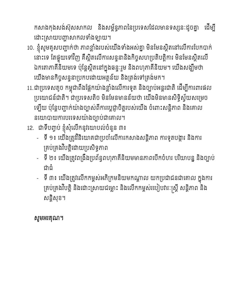 ក្នុងកាលៈទេសៈដែលសណ្ដាប់ធ្នាប់ពិភពលោកបច្ចុប្បន្នកំពុងវិវឌ្ឍ និងបែកខ្ញែក យើងត្រូវ រក្សាការពារអធិបតេយ្យរបស់ខ្លួនប្រកបដោយគតិបណ្ឌិត ផ្អែកលើច្បាប់អន្តរជាតិ ស្របតាមគោលការណ៍ធម្មនុញ្ញអង្គការសហប្រជាជាតិ និងផ្ដោតលើសុខមាលភាពរបស់ប្រជា ជនយើង ដោយការប្រកាន់ខ្ជាប់នូវអភិក្រមយកប្រជាជនជាស្នូល (people-centeredapproach) ។
