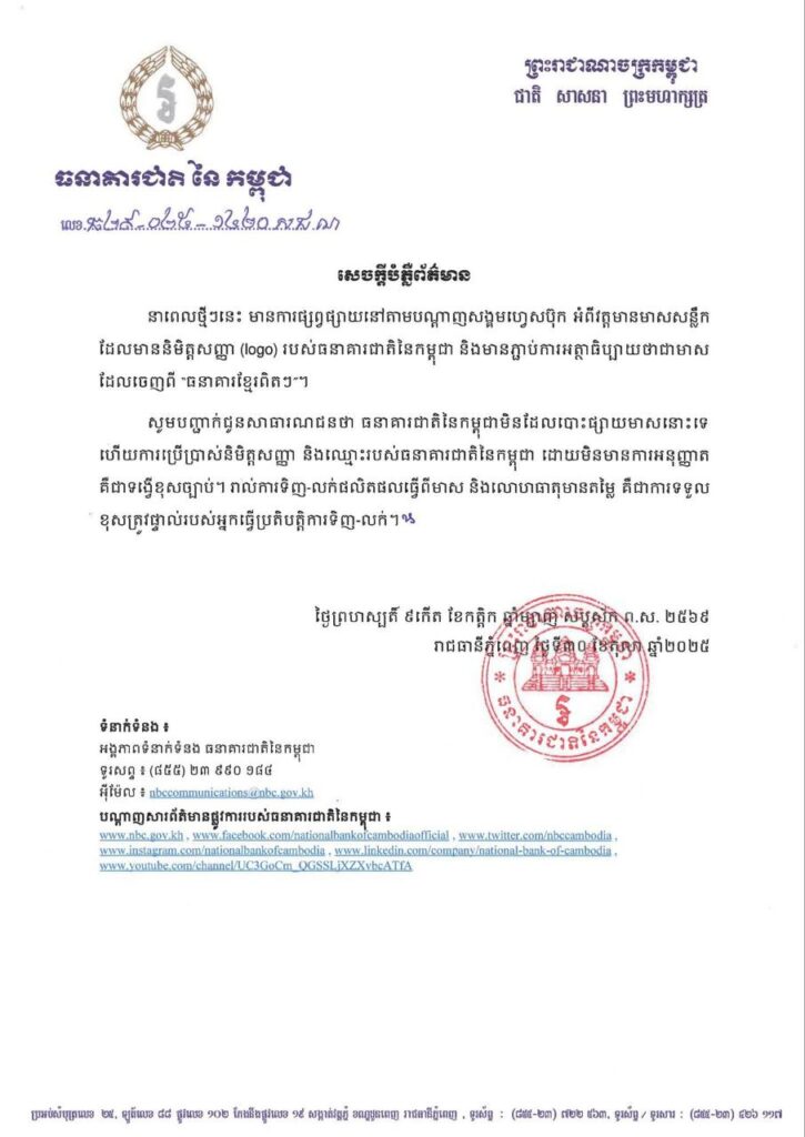 ភ្នំពេញ៖ ធនាគារជាតិនៃកម្ពុជា នៅថ្ងៃទី៣០ ខែតុលា ឆ្នាំ២០២៥នេះ បានចេញសេចក្តីបំភ្លឺព័ត៌មានទាក់ទងនឹងការផ្សព្វផ្សាយតាមបណ្តាញសង្គមអំពីវត្តមានមាសសន្លឹក ដែលមាននិមិត្តសញ្ញា (logo) របស់ធនាគារជាតិនៃកម្ពុជា ដោយអំពាវនាវដល់សាធារណជន មេត្តាប្រុងប្រយ័ត្ន។ ធនាគារជាតិនៃកម្ពុជា បញ្ជាក់ថា ខ្លួនមិនដែលបោះផ្សាយមាសនោះទេ។