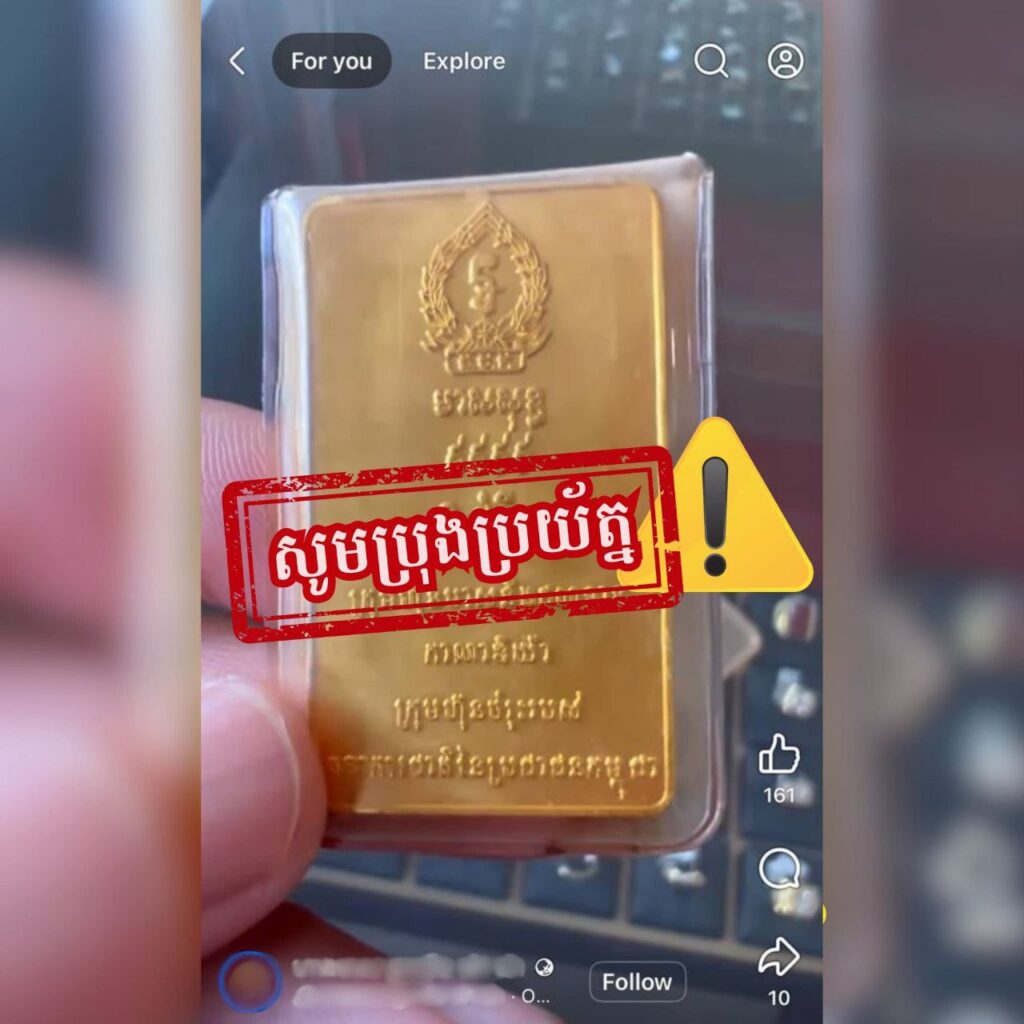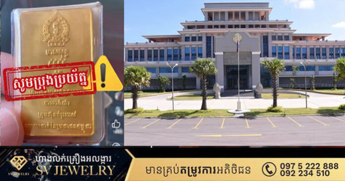 សូមបញ្ជាក់ជូនសាធារណជនថា ធនាគារជាតិនៃកម្ពុជាមិនដែលបោះផ្សាយមាសនោះទ ហើយការប្រើប្រាស់និមិត្តសញ្ញា និងឈ្មោះរបស់ធនាគារជាតិនៃកម្ពុជា ដោយមិនមានការអនុញ្ញាត គឺជាទង្វើខុសច្បាប់។ រាល់ការទិញ-លក់ផលិតផលធ្វើពីមាស និងលោហធាតុមានតម្លៃ គឺជាការទទួល