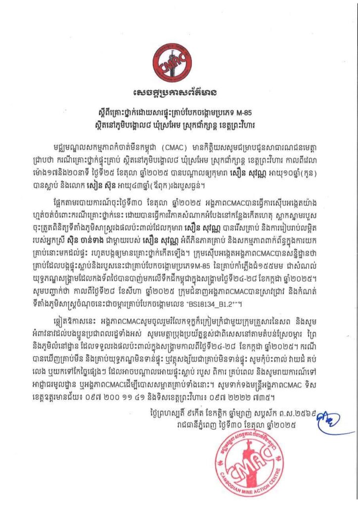 ករណីគ្រោះថ្នាក់ផ្ទុះគ្រាប់ ស្ថិតនៅភូមិបង្គោល៨ ឃុំស្រអែម ស្រុកជាំក្សាន្ត ខេត្តព្រះវិហារ កាលពីវេលាម៉ោង១៧និង២០នាទី ថ្ងៃទី២៥ ខែតុលា ឆ្នាំ២០២៥ បានបណ្តាលឲ្យកុមារា សឿន សុវណ្ណ អាយុ១០ឆ្នាំ(កូន)បានស្លាប់ និងលោក សៀន ស៊ុន អាយុ៤៣ឆ្នាំ(ឪពុក)រងរបួសធ្ងន់។
