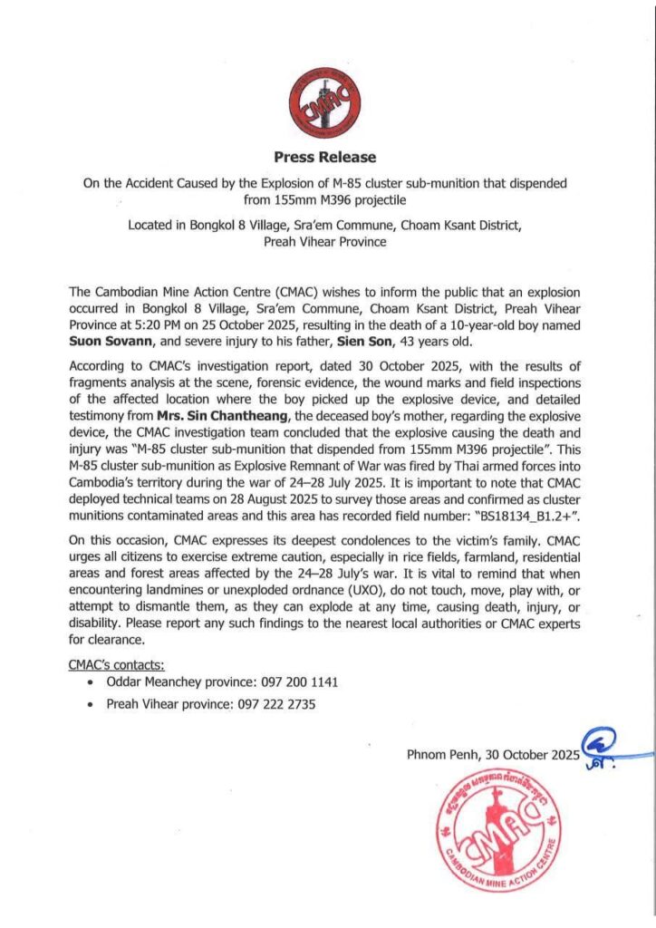 ផ្អែកតាមរបាយការណ៍ចុះថ្ងៃទី៣០ ខែតុលា ឆ្នាំ២០២៥នេះ របស់អង្គភាពCMAC បានសន្និដ្ឋានថាគ្រាប់ដែលបង្កផ្ទុះស្លាប់និងរបួសនេះជាគ្រាប់បែកចង្កោមប្រភេទM-85 នៃគ្រាប់កាំភ្លើងធំ១៥៥មម ជាសំណល់យុទ្ធភណ្ឌសង្រ្គាមដែលកងទ័ពថៃបានបាញ់មកលើទឹកដីកម្ពុជាក្នុងសង្គ្រាមថ្ងៃទី២៤-២៨ ខែកក្កដា ឆ្នាំ២០២៥។