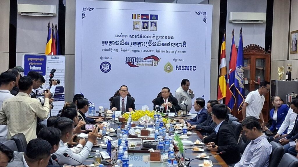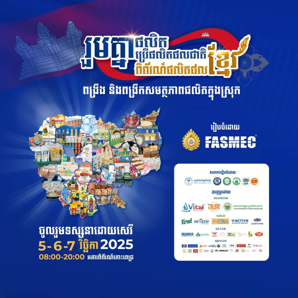 ក្លិបអ្នកកាសែតកម្ពុជា (ក.អ.ក) សូមជម្រាបជូនថា ដោយមានការគាំទ្រពីសមាគមមូលនិធិ សម្តេចតេជោ ដើម្បីអភិវឌ្ឍន៍សហគ្រាសធុនតូច និងមធ្យមនៅកម្ពុជា (FASMEC) ក.អ.ក រៀបចំ វេទិកាសារព័ត៌មានដូចប្រធានបទខាងលើ ដើម្បីផ្ដល់ឱកាសដល់ថ្នាក់ដឹកនាំ FASMEC បានលើក ឡើងជាថ្មីម្ដងទៀតពីការពង្រឹង និងពង្រីកផលិតផលក្នុងស្រុកទាំងបរិមាណ និងគុណភាព សុវត្ថិភាព ធ្វើយ៉ាងណាបំពេញតម្រូវការប្រើប្រាស់អំឡុងពេលពហិការមិនប្រើប្រាស់ផលិតផលប្រទេសថៃ។ ឱកាស និងបញ្ហាប្រឈម រួមទាំងដំណោះស្រាយ និងសន្ទុះនៃការគាំទ្រផលិតផលក្នុងស្រុកក៏នឹងត្រូវ បានលើកឡើងក្នុងវេទិកាសារព័ត៌មាននេះផងដែរ។ វេទិកានេះក៏មានការតាំងបង្ហាញផលិតផលក្នុងស្រុកសំខាន់ៗដែលគ្រោងនឹងដាក់តាំងក្នុងពិព័រណ៍ផលិតផលខ្មែរ ឆ្នាំ២០២៥ លើកទី២ ដែលនឹងត្រូវ រៀបចំធ្វើឡើងនៅមជ្ឈមណ្ឌលសាលសន្និបាត និងពិព័រណ៍កោះពេជ្រ រយៈពេល៣ថ្ងៃ ចាប់ពីថ្ងៃ ទី៥ ដល់ថ្ងៃទី៧ ខែវិច្ឆិកា ឆ្នាំ២០២៥។