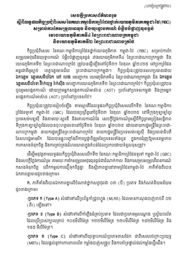 ព្រំដែនកម្ពុជាថៃ៖ លោកជំទាវ ឧត្តមសេនីយ៍ឯក ម៉ាលី សុជាតា អ្នកនាំពាក្យក្រសួងការពារជាតិ នៃព្រះរាជាណាចក្រកម្ពុជា សូមជម្រាបជូនសាធារណជន អ្នកសារព័ត៌មានជាតិ និងអន្តរជាតិមេត្តាជ្រាបថា៖ នៅថ្ងៃទី៣១ ខែតុលា ឆ្នាំ២០២៥ នាវេលាម៉ោង ១៥:០៥នាទីរសៀលនេះ នៅច្រកព្រំដែនអូរស្មាច់ ខេត្តឧត្តរមានជ័យ យោធភូមិភាគទី៤ កម្ពុជា និងកងទ័ពភូមិភាគទី២ ថៃ បានរៀបចំកិច្ចប្រជុំពិសេស នៃគណៈកម្មាធិការព្រំដែនថ្នាក់យោធភូមិភាគ កម្ពុជា-ថៃ (RBC) សម្រាប់ពិភាក្សាលើការកែសម្រួលអាវុធ និងយុទ្ធោបករណ៍បំផ្លិចបំផ្លាញធុនធ្ងន់ បន្ទាប់ពីកិច្ចប្រជុំពិសេសក្រុមលេខាធិការដ្ឋាន នៃគណៈកម្មាធិការព្រំដែនថ្នាក់យោធភូមិភាគ កម្ពុជា-ថៃ (RBC) កាលពីព្រឹកមិញនេះ។ សហប្រធានដឹកនាំកិច្ចប្រជុំដោយ ឯកឧត្តម ឧត្តមសេនីយ៍ឯក ពៅ ហេង មេបញ្ជាការយោធភូមិភាគទី៤ នៃព្រះរាជាណាចក្រកម្ពុជា និង ឯកឧត្តម ឧត្តមសេនីយ៍ទោ វីរ៉ាក់យុទ្ធ រ៉ាក់ស៊ីង មេបញ្ជាការ កងទ័ពភូមិភាគទី២ នៃព្រះរាជាណាចក្រថៃ ដោយមានការចូលរួមពីក្រុមអ្នកសង្កេតការណ៍អាស៊ាន (AOT) ប្រចាំនៅប្រទេសកម្ពុជា និងប្រចាំនៅប្រទេសថៃ ដើម្បីតាមដាន ផ្ទៀងផ្ទាត់ និងធានាការអនុវត្តបទឈប់បាញ់ឱ្យបានពេញលេញ ភាពត្រឹមត្រូវ និងមានប្រសិទ្ធភាព។
