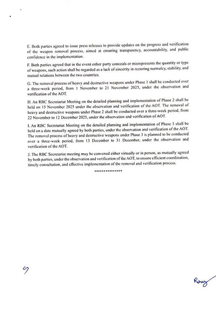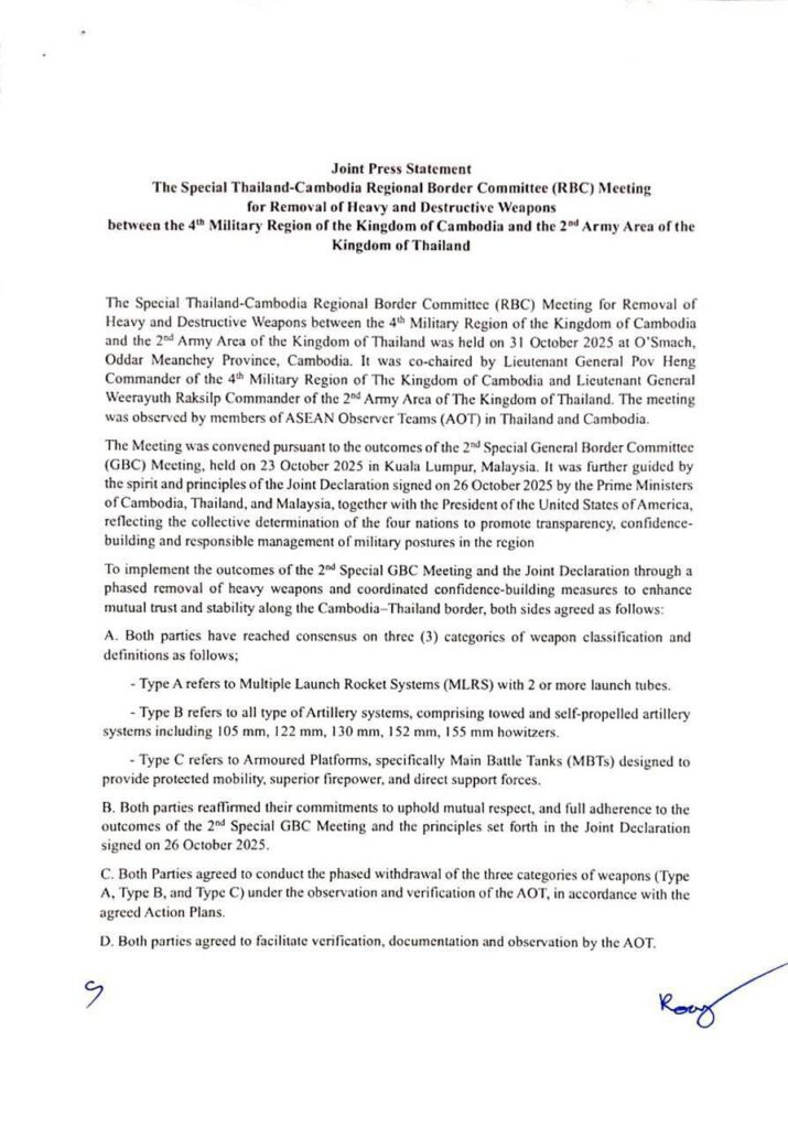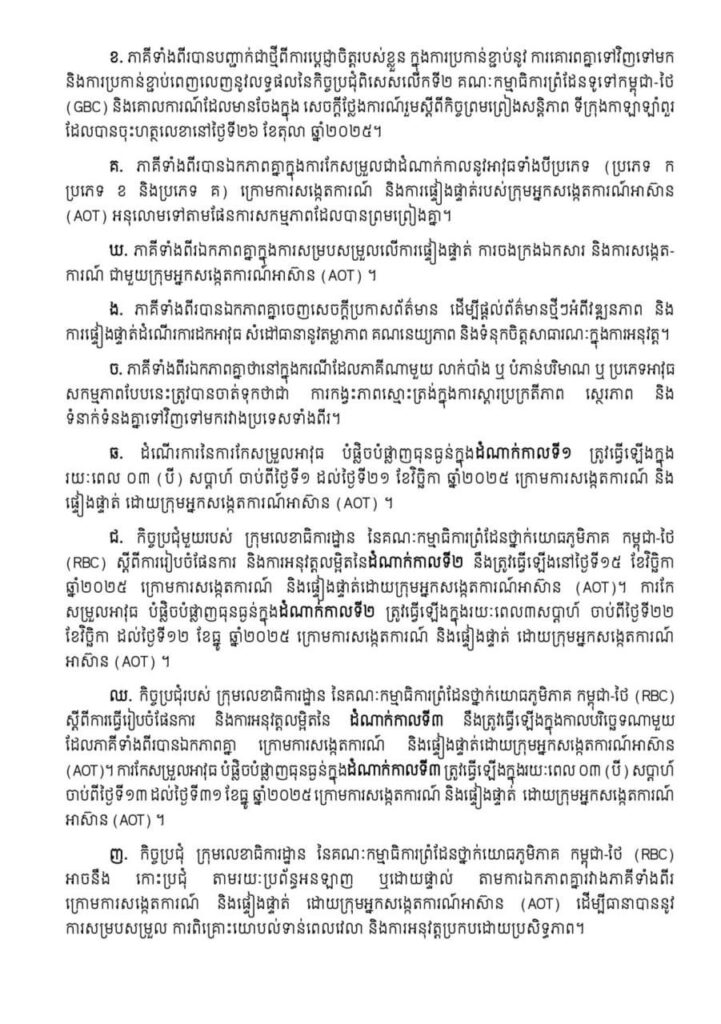 ភាគីទាំងពីរបានពិភាក្សា និងឯកភាពគ្នាលើផែនការជាក់លាក់ ក្នុងការសម្រួលយុទ្ធោបករណ៍ និងអាវុធធុនធ្ងន់របស់ភាគីទាំងសងខាងជាជំហានៗ និងតាមដំណាក់កាល នៅក្រោមការសង្កេត និងការផ្ទៀងផ្ទាត់របស់ AOT សំដៅរួមគ្នាកាត់បន្ថយភាពតានតឹងផ្នែកយោធា។ កិច្ចប្រជុំនេះបានឆ្លុះបញ្ចាំងពីការប្តេជ្ញាចិត្តរបស់ភាគីទាំងពីរក្នុងការគោរព និងអនុវត្តនូវអ្វីដែលបានឯកភាពគ្នានៅក្នុងសេចក្តីថ្លែងការណ៍រួមទីក្រុងកូឡាឡាំពួរ ស្តីពីសន្តិភាពរវាងកម្ពុជានិងថៃ ដែលបានចុះហត្ថលេខាកាលពីថ្ងៃទី២៦ ខែតុលា ឆ្នាំ២០២៥ រវាងសម្តេចមហាបវរធិបតី ហ៊ុន ម៉ាណែត នាយករដ្ឋមន្ត្រី នៃព្រះរាជាណាចក្រកម្ពុជា និងនាយករដ្ឋមន្ត្រីថៃ ដោយមានឯកឧត្តមប្រធានាធិបតីសហរដ្ឋអាម៉េរិក ដូណាល់ ត្រាំ និងឯកឧត្តមនាយករដ្ឋមន្ត្រីម៉ាឡេស៊ី អាន់វ៉ា អ៊ីប្រាហ៊ីម ធ្វើជាសាក្សីផងដែរ និងកិច្ចប្រជុំពិសេសលើកទី២ នៃគណៈកម្មាធិការព្រំដែនទូទៅ កម្ពុជា-ថៃ (GBC) ដែលប្រព្រឹត្តទៅនៅប្រទេសម៉ាឡេស៊ី កាលពីថ្ងៃទី២៣ ខែតុលា ឆ្នាំ២០២៥ ដោយស្មោះត្រង់ និងប្រកបដោយសុច្ឆន្ទៈដ៏ពិតប្រាកដ។