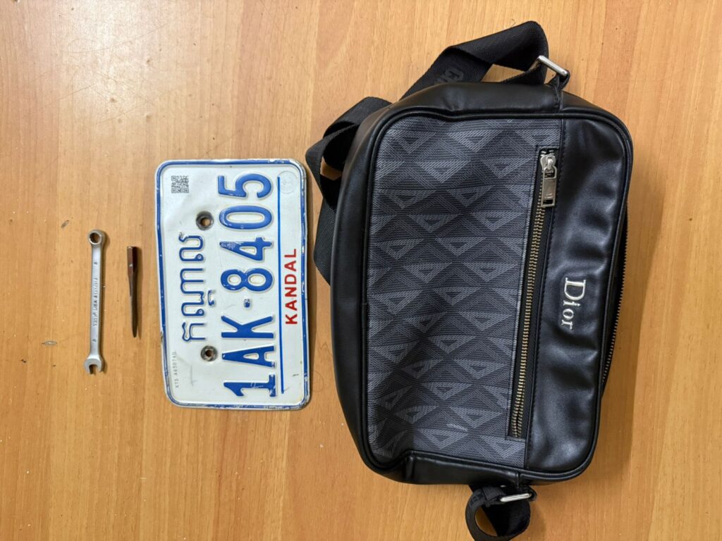 ២.កាបូបស្ពាយពណ៌ខ្មៅម៉ាកDior ចំនួន០១។ ៣.ស្លាកលេខម៉ូតូ ចំនួន០១ ។ ៤.ដែកកែឆ្នៃមុខស្រួច សម្រាប់កាច់កម៉ូតូ ចំនួន០១។ ៥.កូនសោមាត់លេខ៨ចំនួន០១ ចាប់យកពីជនសង្ស័យឈ្មោះ ចាន់ ម៉ានូន ។